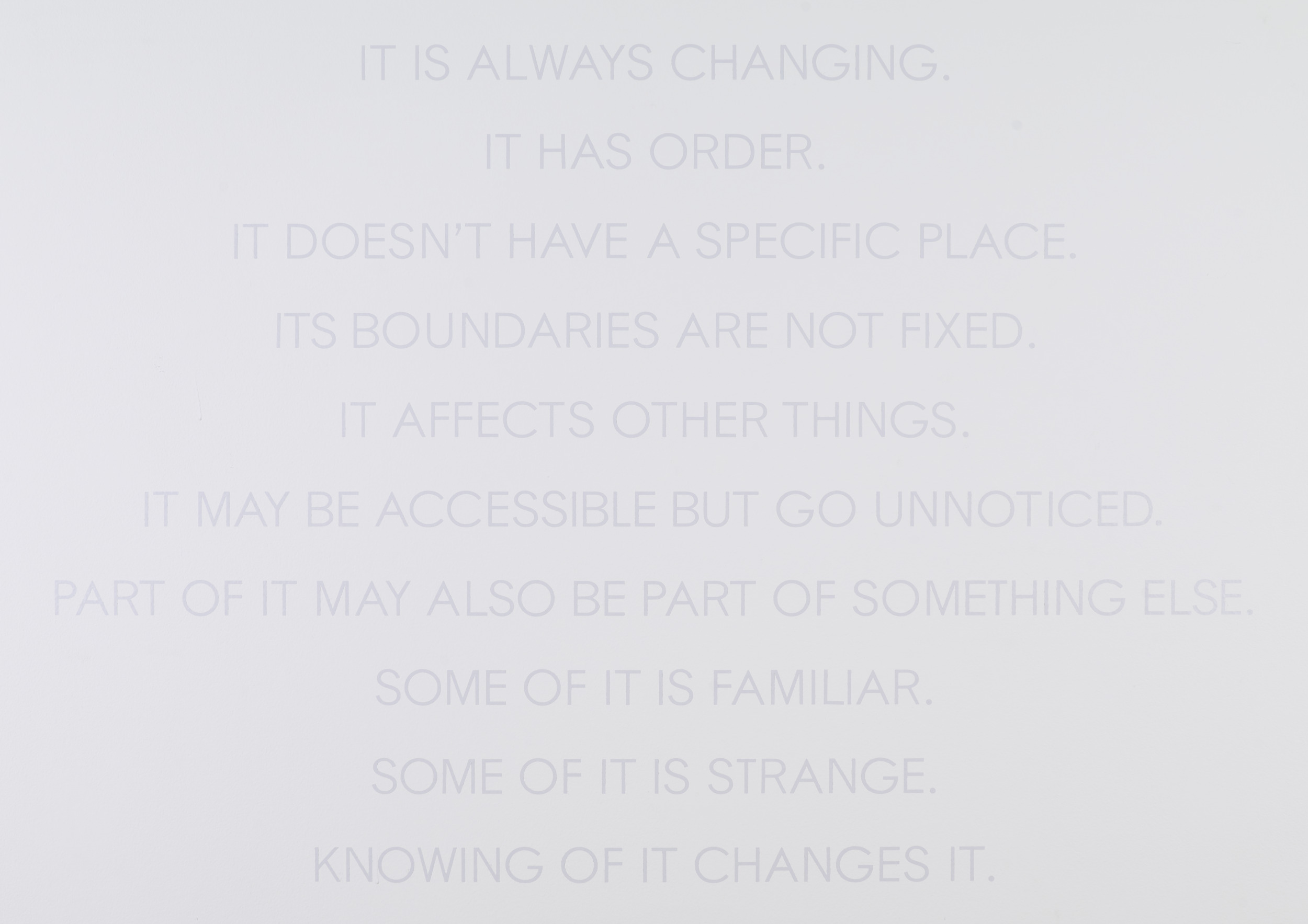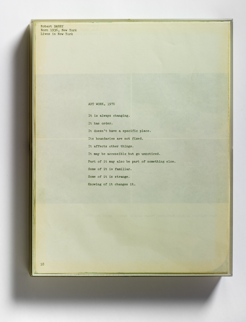 Taken together, this series of ten short texts offers a description of a Conceptual work of art. Conceptual art was at its zenith from the late 1960s through the 1970s as many international artists worked to develop ideas and propositions about the nature and boundaries of art that engaged the intellect and imagination of their viewers. Robert Barry’s idea of an artwork that is “always changing” and has unfixed “boundaries” emerged from the artist’s Minimalist painting and sculptural practice of the late 1960s. His work became increasingly subtle around 1968, when he began to employ invisible materials such as radio waves and radiation, the presence of which could only be suggested with text. In 1969, Barry removed all material reference in his art, producing a series of purely language-based works. These were presented either as statements in exhibition catalogues or as text inscribed directly on the wall of the exhibition space. While Art Work has been published and exhibited in many contexts, it is best known as Barry’s contribution to the catalogue of the watershed Conceptual art exhibition, Information, held at The Museum of Modern Art in the summer of 1970.