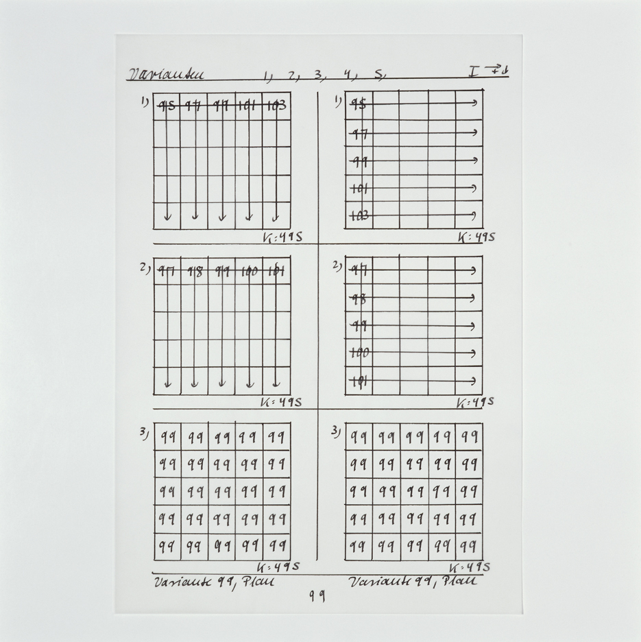 Often using the current calendar date as her starting point, Hanne Darboven produced systematic charts and sequences of numbers as well as long strands of looped forms that evoke handwriting. Both serve as methods of counting and marking time as well as giving material form to its passage. While the artist’s drawings often explore the many possible relationships that can exist between integers, her use of numbers in no way represents an interest in mathematical logic, as Darboven herself warned, “I only use numbers because it is a way of writing without describing. . . . I choose numbers because they are so constant, confined, and artificial.”