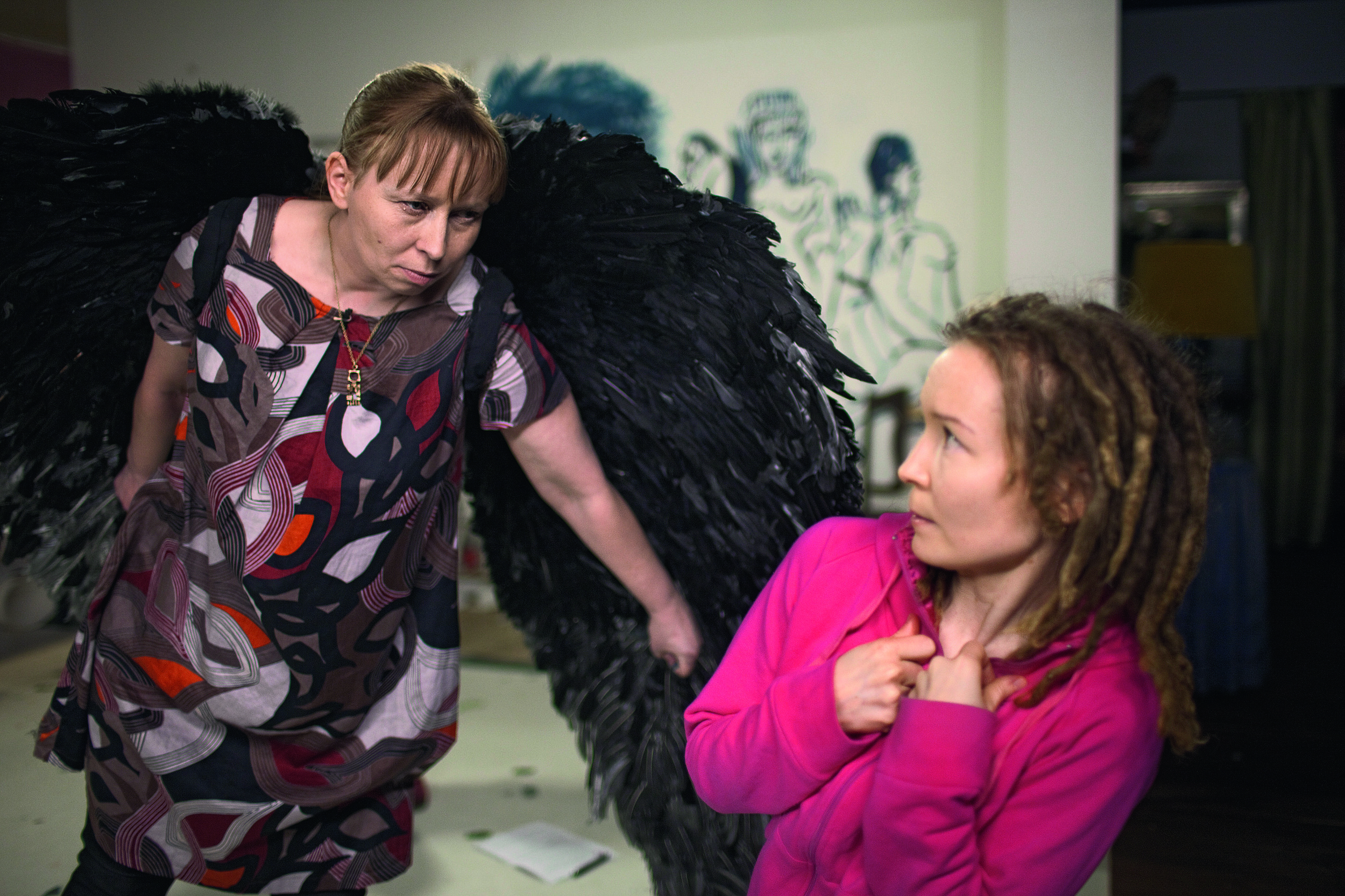 In Ahtila’s Annunciation the events are set in the present. The film follows rehearsals for a theatrical reenactment of the Annunciation and ends with the final performance. The footage was shot mainly during the winter of 2010 in the snowy Aulanko Nature Reserve in southern Finland and on a set depicting an artist’s studio. All human actors except for two are nonprofessionals, and most of them were clients of the Helsinki Deaconess Institute’s women’s support services. The animal actors include a trained raven, two donkeys, and a group of carrier pigeons from a bird farm.