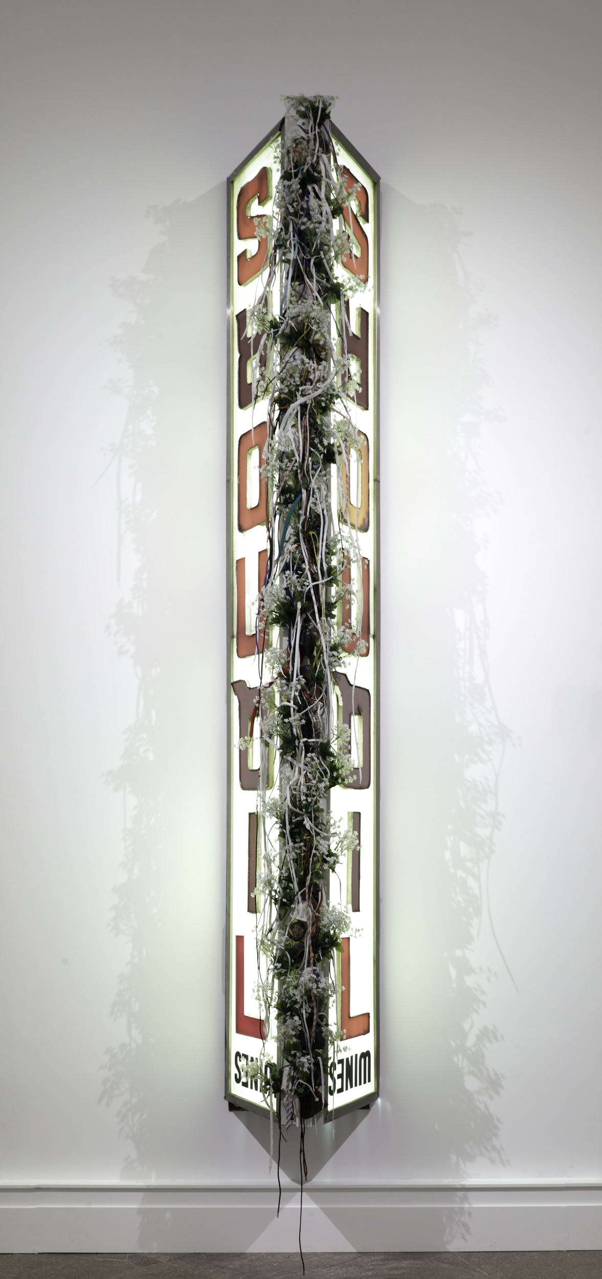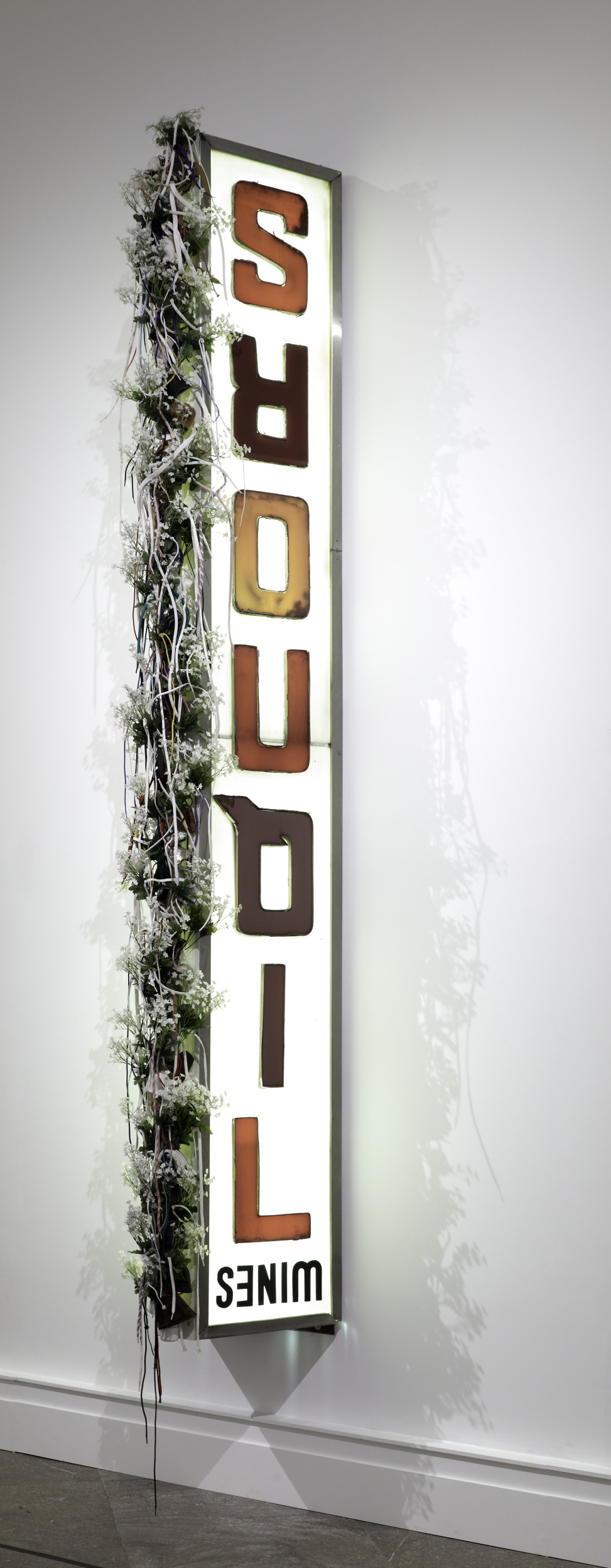 Loisaidas LiquorsouL belongs to a series of works Ward began in 2010 that consider dilapidated liquor store signs as urban artifacts. The idea for the series first occurred to the artist when he realized that the word “soul” was embedded in the word “liquors” in an unlit sign above a ramshackle building. The title of each work includes the word “LiquorsouL”; “Loisaidas” is a Spanish slang term for New York’s Lower East Siders. On the edge of where the two signs meet, Ward incorporated artificial flowers, shoelaces, and plastic shoe tips. The artist often utilizes these materials in his practice because they echo shared memories. In this work, for example, such elements allude to roadside memorials. “When a kid is shot or even an older person dies, people put up flowers and the person’s name maybe, and they always use alcohol bottles, half-drunk, or sometimes poured out for the person,” Ward explains. “In many religions alcohol serves as a metaphor, a reference to a rite of passage, and a move from one state to the next.”