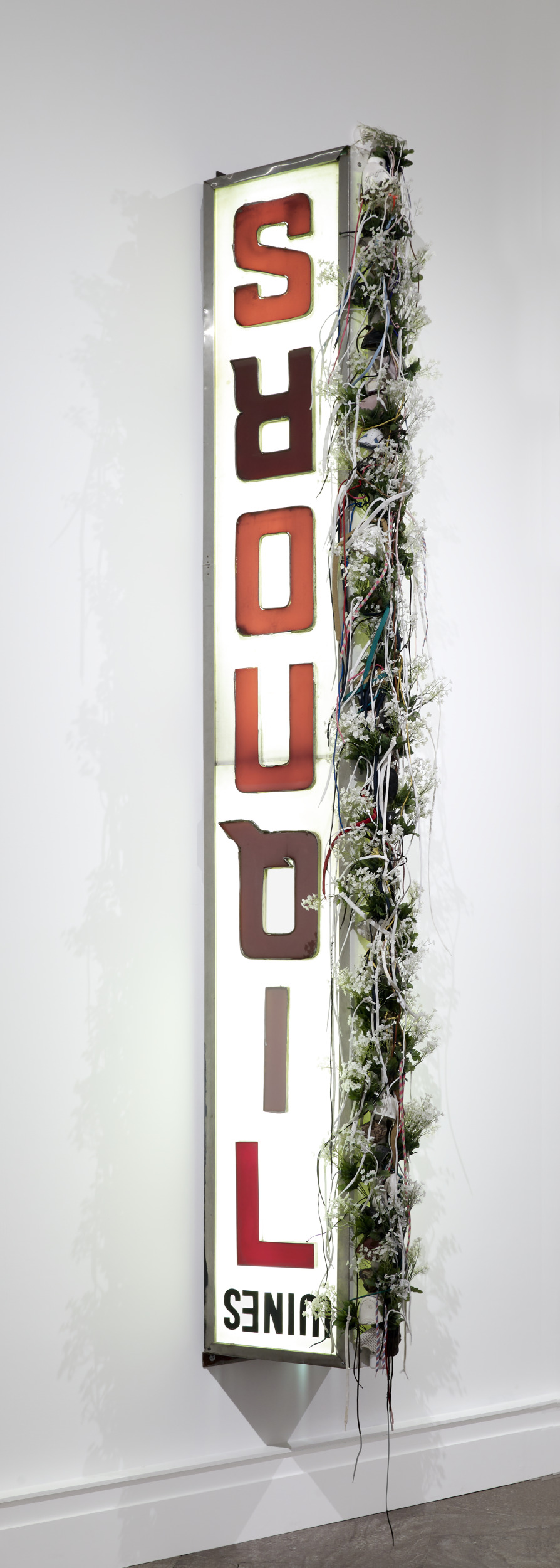metal, Plexiglas, fluorescent sign, PVC pipe, artificial flowers, shoelaces, and shoe tips
