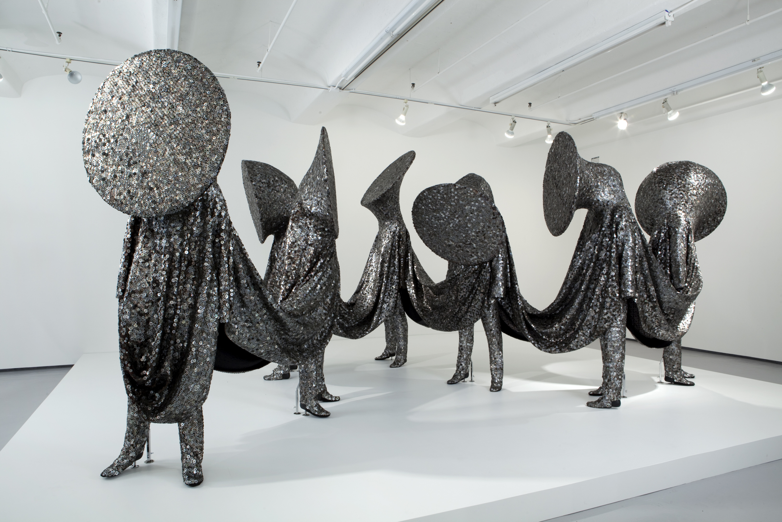 For Cave, Speak Louder is “a piece about speaking and not being heard,” and a platform to address what he has identified as one of the most pressing issues challenging his current hometown of Chicago: how the voices of those disproportionally impacted by violence, especially young black men, are often unheard or deliberately silenced in the civic dialogue around this problem. The oversized headpieces topping the soundsuits in Speak Louder resemble devices for fulfilling the command given by the work’s title; they suggest the flared discs of speakers or possibly the bells of a tuba or sousaphone. By bringing these figures together, Cave underscores the additive power of coming together as a community to make your voices heard and bring about positive changes. “I want to provide [viewers] with transitional experiences,” Cave has said. “It’s about providing a moment of silence, and at the same time asking, ‘Come out with me and play.’”