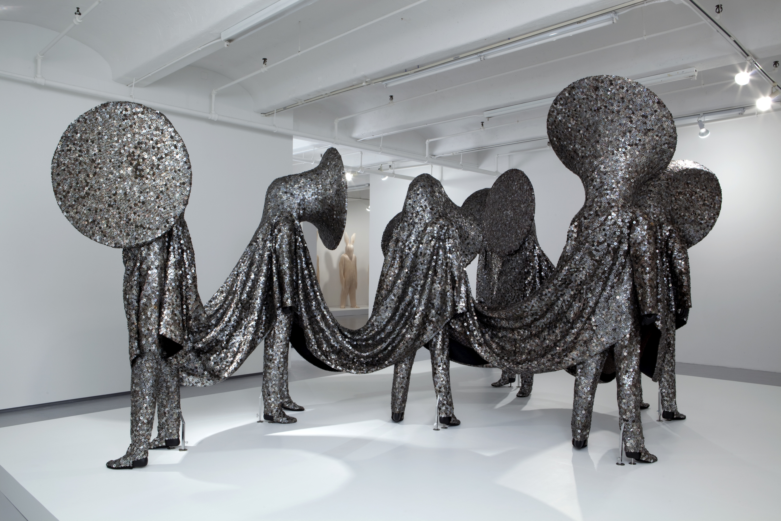 mixed media including black mother-of-pearl buttons, embroidery floss, upholstery, armature, and mannequins