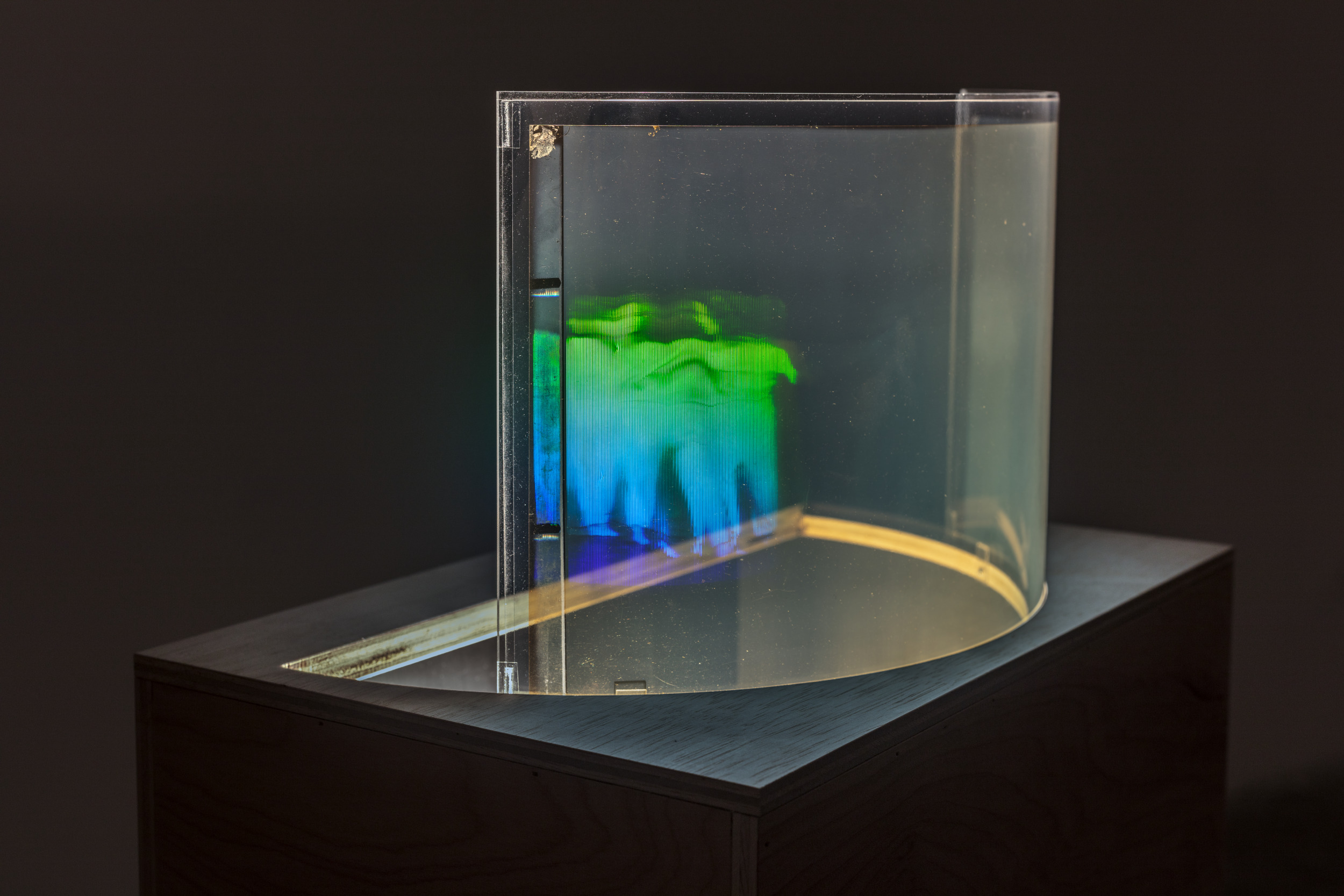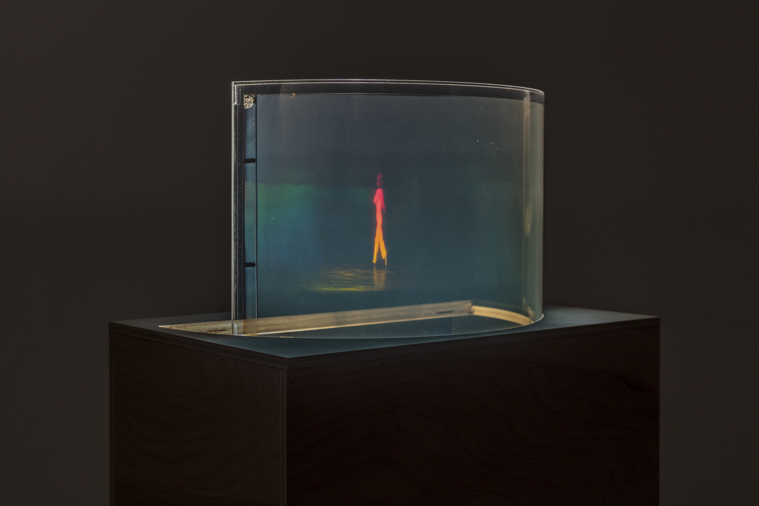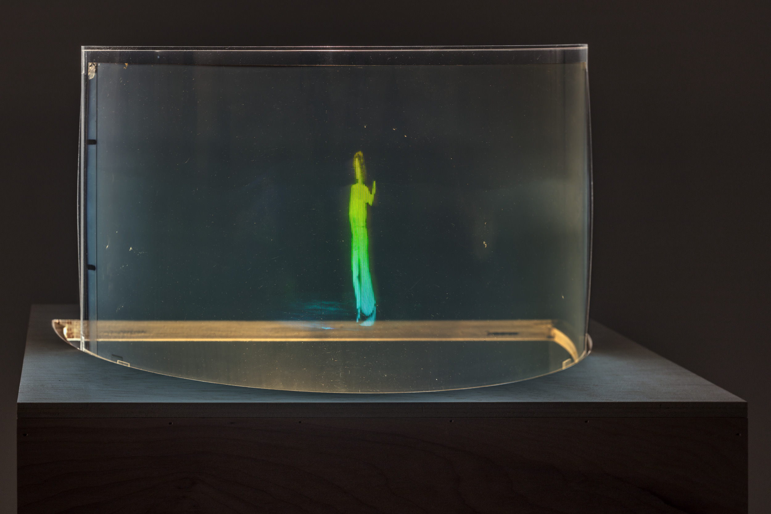 Simone Forti was better known as an avant-garde dancer and choreographer when, in the mid-1970s, she was offered the opportunity to work with Lloyd G. Cross, a physicist and the inventor of moving holographs. In the decade prior, Forti radically reimagined dance as a democratic art form, replacing the complexities of traditional choreography with basic, everyday movements. For her collaboration with Cross, Forti performed such simple, improvisatory gestures—including standing, striding, and crawling—on a black stage. The recordings of these performances then served as the basis for a series of innovative sculptures, including Harmonics (3). Its softly flickering images of the artist walking across the stage in a figure eight and waving her arms are a composite of frames selected from Forti’s filmed performance. The process of translating this footage into the final hologram introduced “glitches” that occasionally transform the artist’s body into new and unexpected abstract forms, offering Forti further opportunities to push the limits of representing the human form.