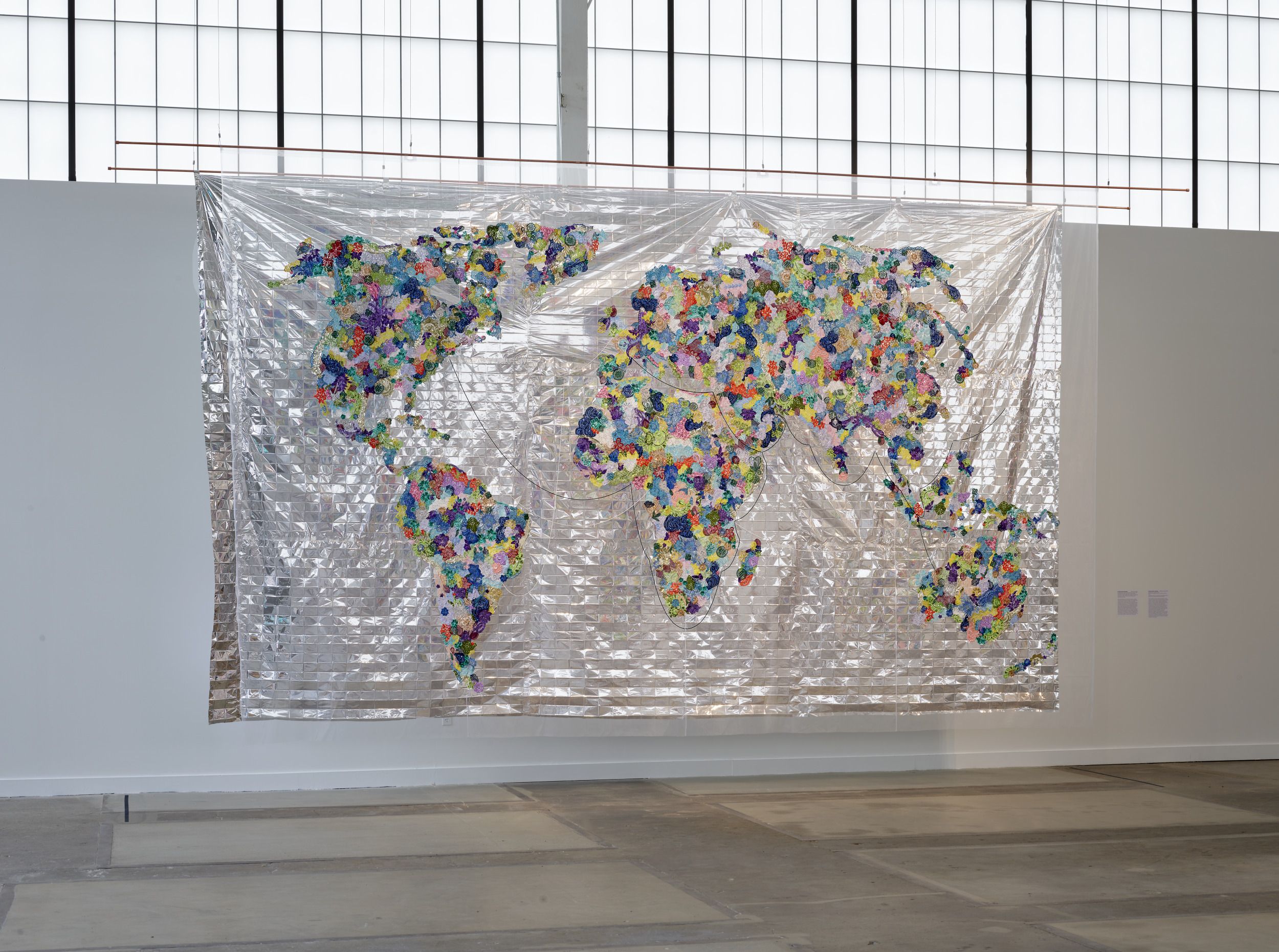 In Desplazamiento y Subsuelo (Displacement and Subsoil), Aranibar-Fernández reveals how massive forces of global history impact individuals and their physical bodies. Embroidered flowers cut from Bolivian mantas, or shawls, make up the artist’s world map. Though first brought to South America by Spanish colonizers who insisted indigenous women wear European attire, over time symbols of imperialist oppression have been reclaimed by indigenous women in a spirit of community pride. Sewn strings of glass beads chart the global migratory histories of other goods and natural resources, as well as the involuntary movement of enslaved people, refugees, and asylum seekers. By including reflective emergency blankets, like those distributed at U.S. Immigration and Customs Enforcement (ICE) detention centers, the artist references the notoriously unjust conditions faced by migrants held at these sites. Yet, the flowers that punctuate the map comment on a relationship between exploitation and resilience: despite the use of land and nature as a source of profit and power, flowers continue to bloom.