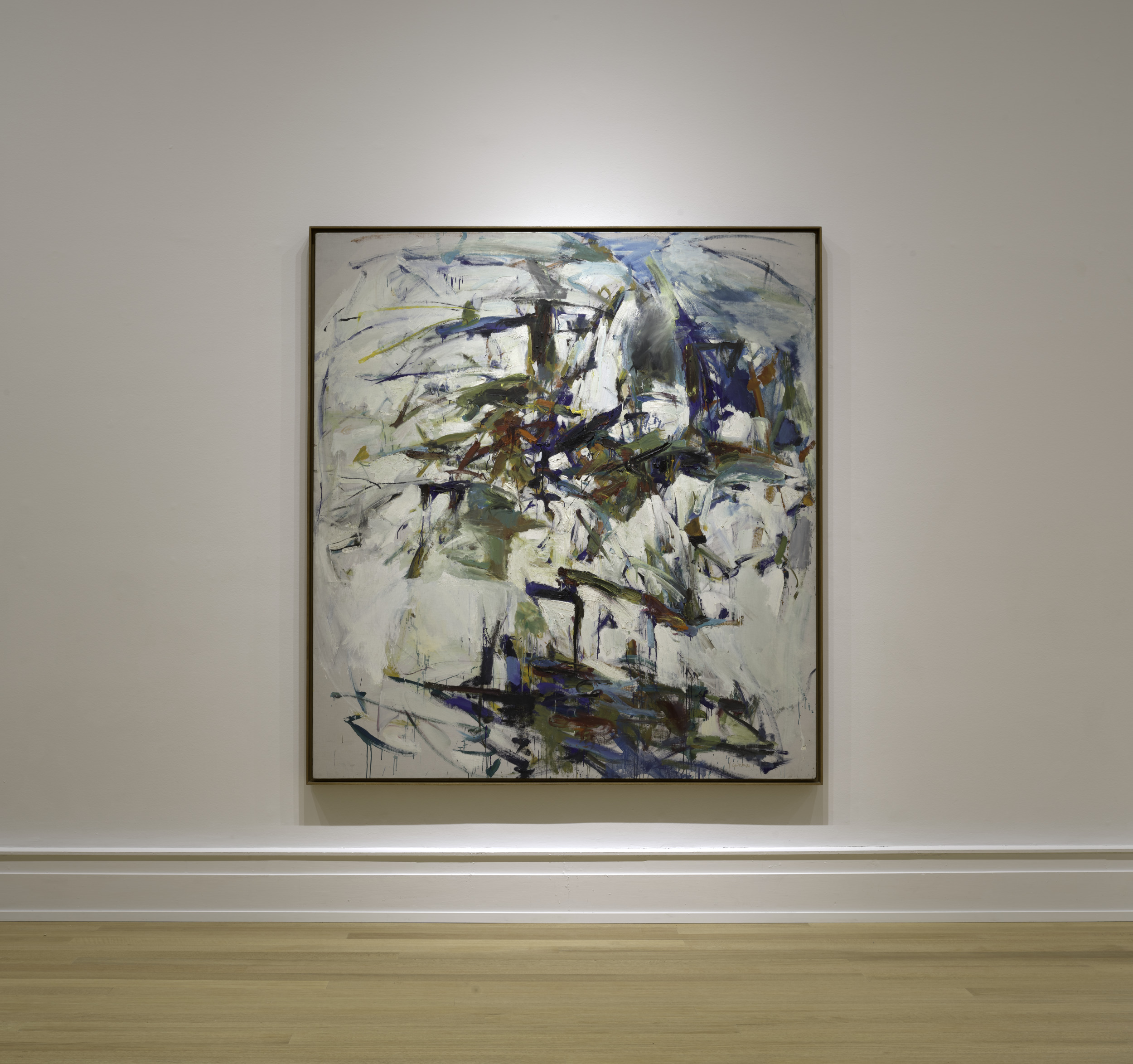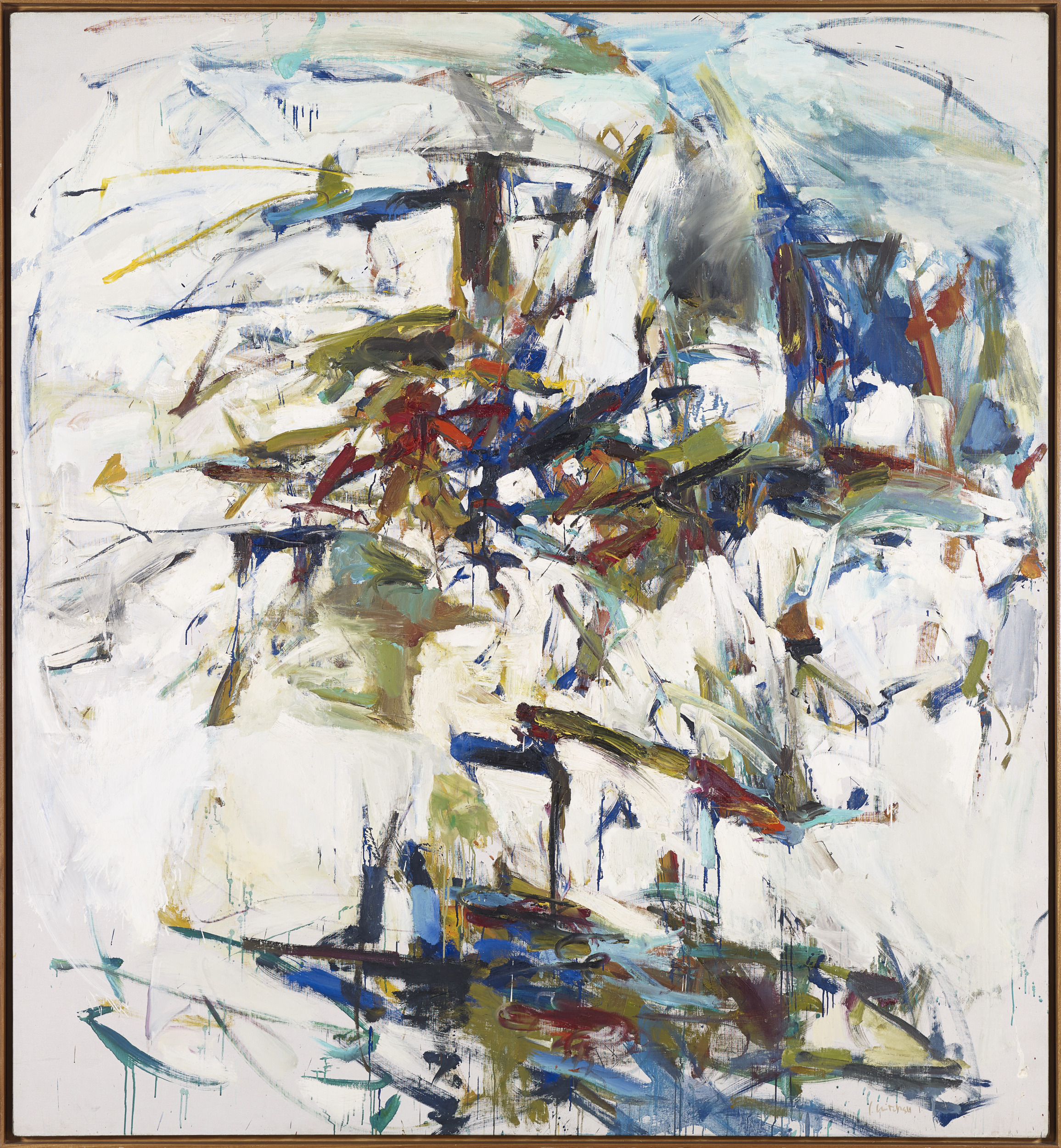 Joan Mitchell’s abstract paintings reflect the people, places, and experiences that made up her life. As she explained, to begin a work she had to “think of something and get into a situation where I feel something, and where I love something, and it was George. George swimming at Barnes Hole [located in Long Island, New York]. We used to go swimming together. . . . I paint out of love. Love or feeling is getting out of yourself and focusing instead on someone or something else.” George, however, is not a person. Instead, it is the name of the Mitchell’s standard poodle, who she loved deeply. George Went Swimming at Barnes Hole, but It Got Too Cold started out with various shades of yellow, but when she returned to the work, eventually Mitchell added whites and blues to create a feeling of chill. By then less happy memories had come into compositional play for the artist—including those of a 1954 hurricane in East Hampton. George was with her in that hurricane, and he died later that year. Mitchell suggested that the colors in the painting may have changed because of her memory of the blue tints in George’s fur, or solely because he was dead. Though the composition’s initial warm palette can still be detected in places, it is subordinate to the now-cold mood of the overall canvas.