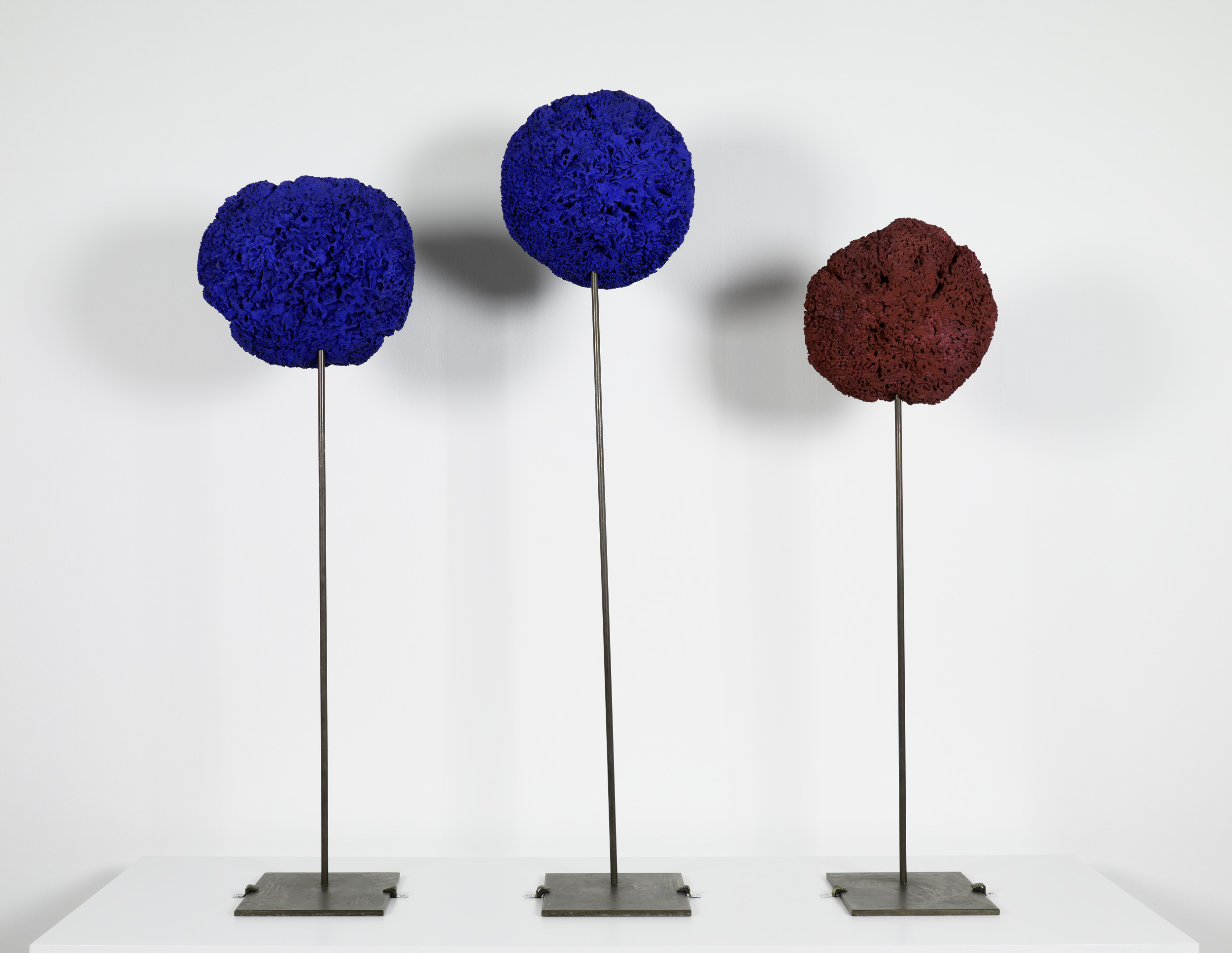 In the late 1950s, Yves Klein created a series of monochromatic paintings using a resilient and powdery ultramarine pigment. It was of great significance to him, symbolizing the physical manifestation of cosmic energy, and he patented the color under the name “International Klein Blue” (IKB). He later developed similarly particular hues of deep pink (IKP) and gold (IKG). Together, he believed these colors to be a holy trinity of equivalency, stating, “Blue, gold, and pink are of the same nature. Any exchange at the level of these three states is honest.” Klein subsequently applied these colors to a series of large sponges that, for him, served as a metaphor for art and the creative process. He either attached these to his canvases as relief elements or affixed them to wire stands as sculptures.