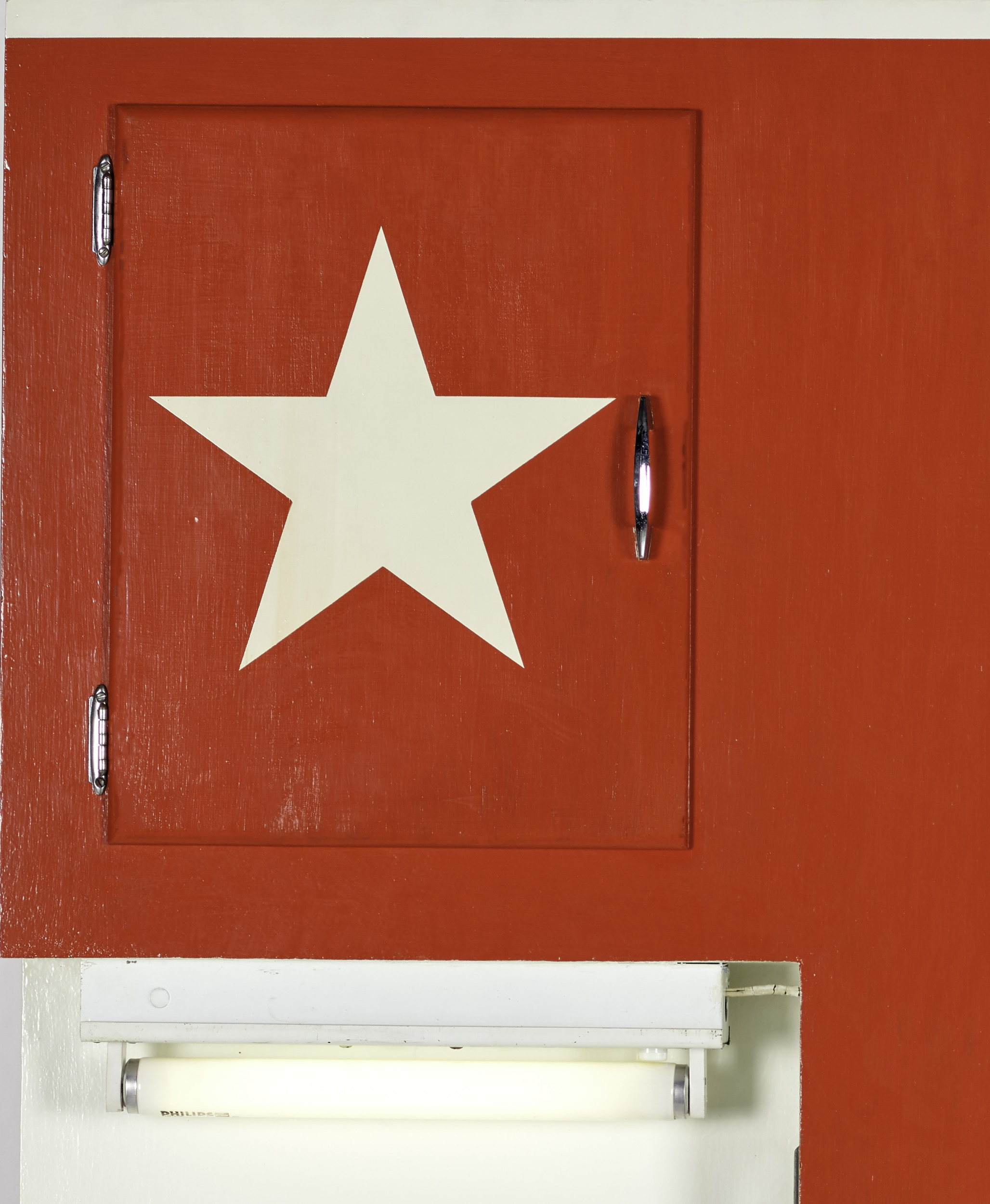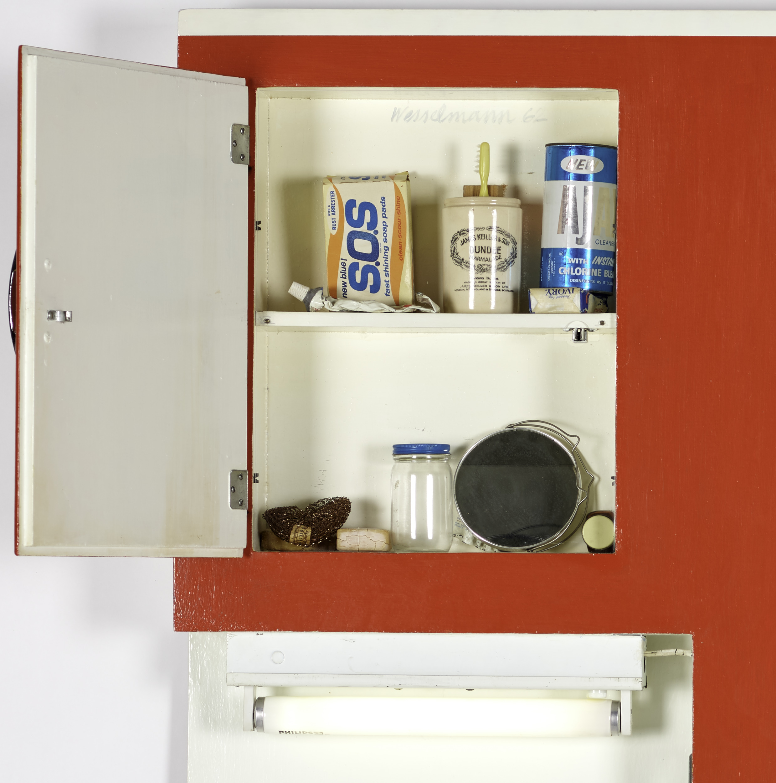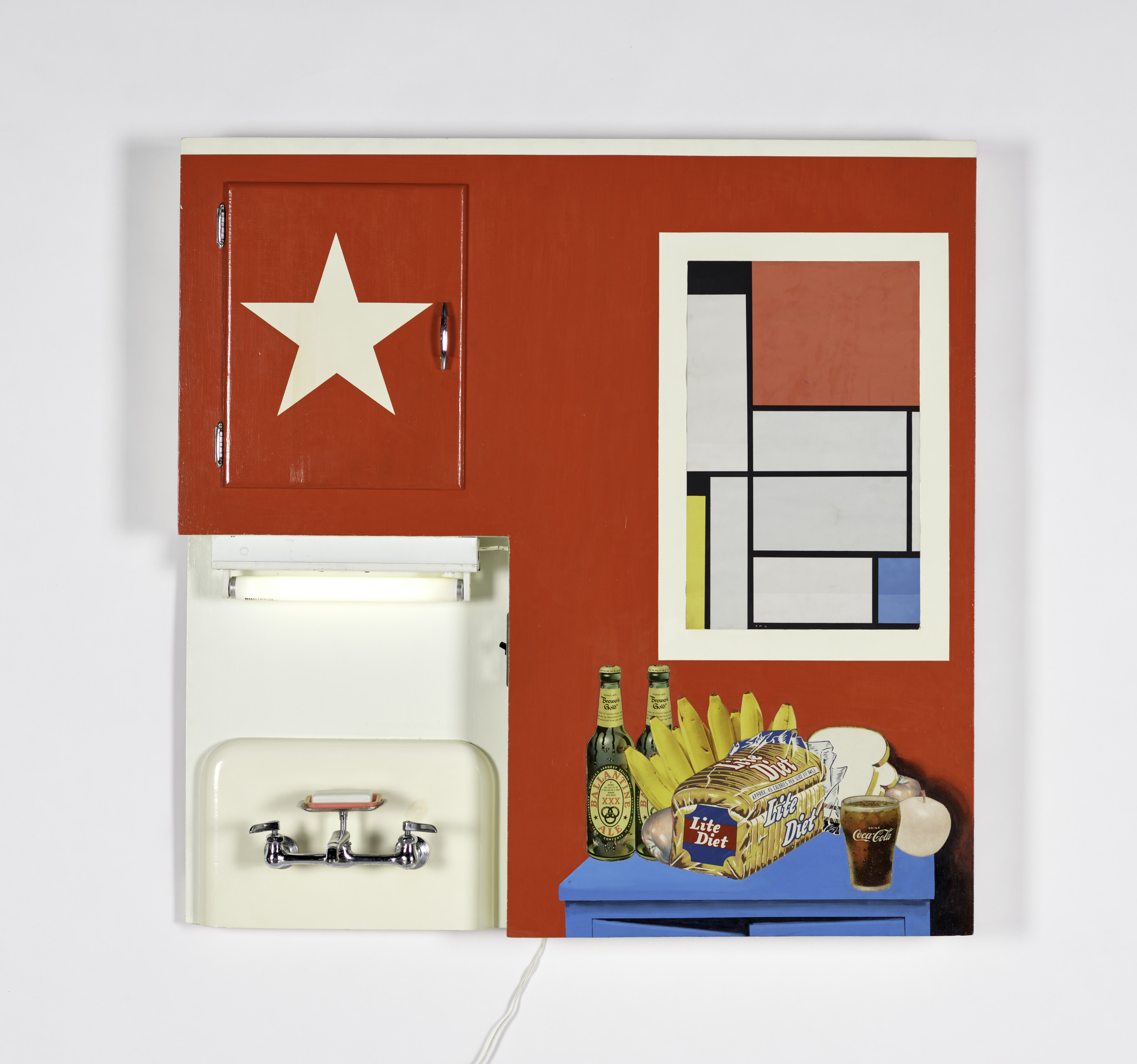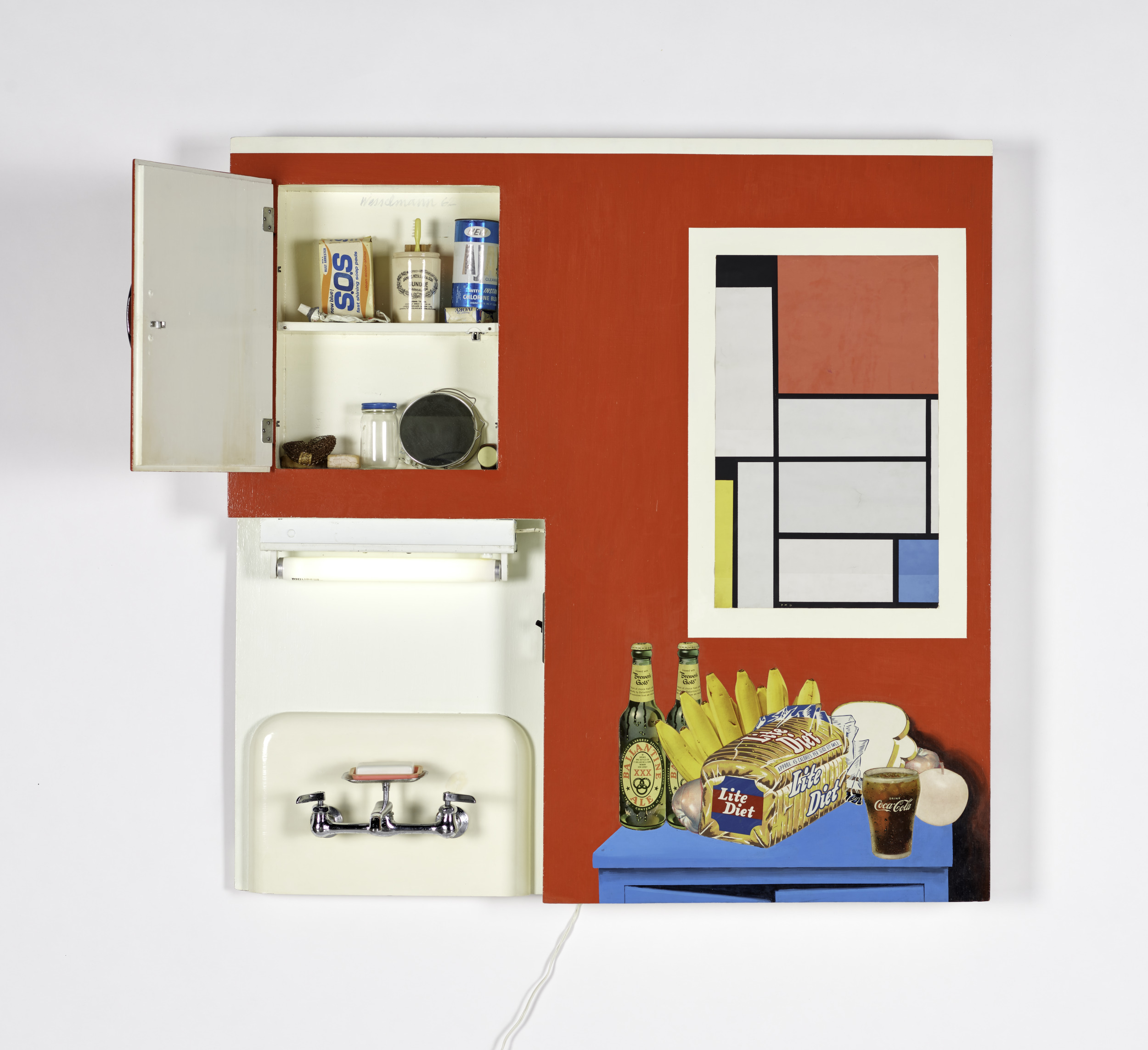 Still Life #20 is part of a series of sculptural still lifes that Pop artist Tom Wesselmann began creating during the early 1960s. The left side features once-functional items that he collected and then placed in a real cabinet above part of an actual sink. The light above the faucet can be turned on or off, and the cabinet can be opened or closed. On the right, Wesselmann collaged into the composition two-dimensional representations of various types of food and drink. Above these appears a reproduction of a painting by the artist Piet Mondrian, who utilized the elements of art in their purest forms—straight lines, right angles, and primary colors—in an attempt to represent a future utopian society. Wesselmann often included reproductions of the work of other artists in his constructions to demonstrate the ways in which art was becoming integrated into the fabric of everyday life and had joined the commercial world.