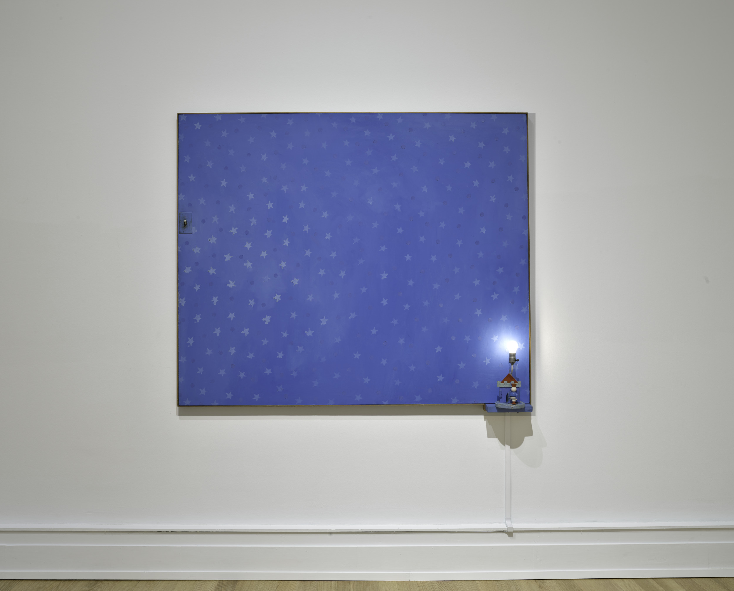 In 1959, Jim Dine traveled to New York, where, along with other avant-garde artists, he participated in some of the city’s early Happenings, which were spontaneous and experiential performances that often encouraged the audience to participate. A year later, he began to focus more on a painterly practice that incorporated physical objects—a love of which came from working in his family’s hardware stores as a youth. Many of his Pop art contemporaries worked with commercially branded materials that are devoid of expression or feeling. However, it was Dine’s desire to elicit emotion through the use of more personal items. Child’s Blue Wall is a poignant tableau from his series of works that engage the subject of children’s bedrooms. It can be variously interpreted as a depiction of starry wallpaper, the pale sky of dusk or dawn, or an altogether imagined scene. The attached lamp may be turned on or off, changing the appearance of the overall painting and introducing further ambiguity. These multiple references often occur in Dine’s work, which is frequently poetic and autobiographical.
