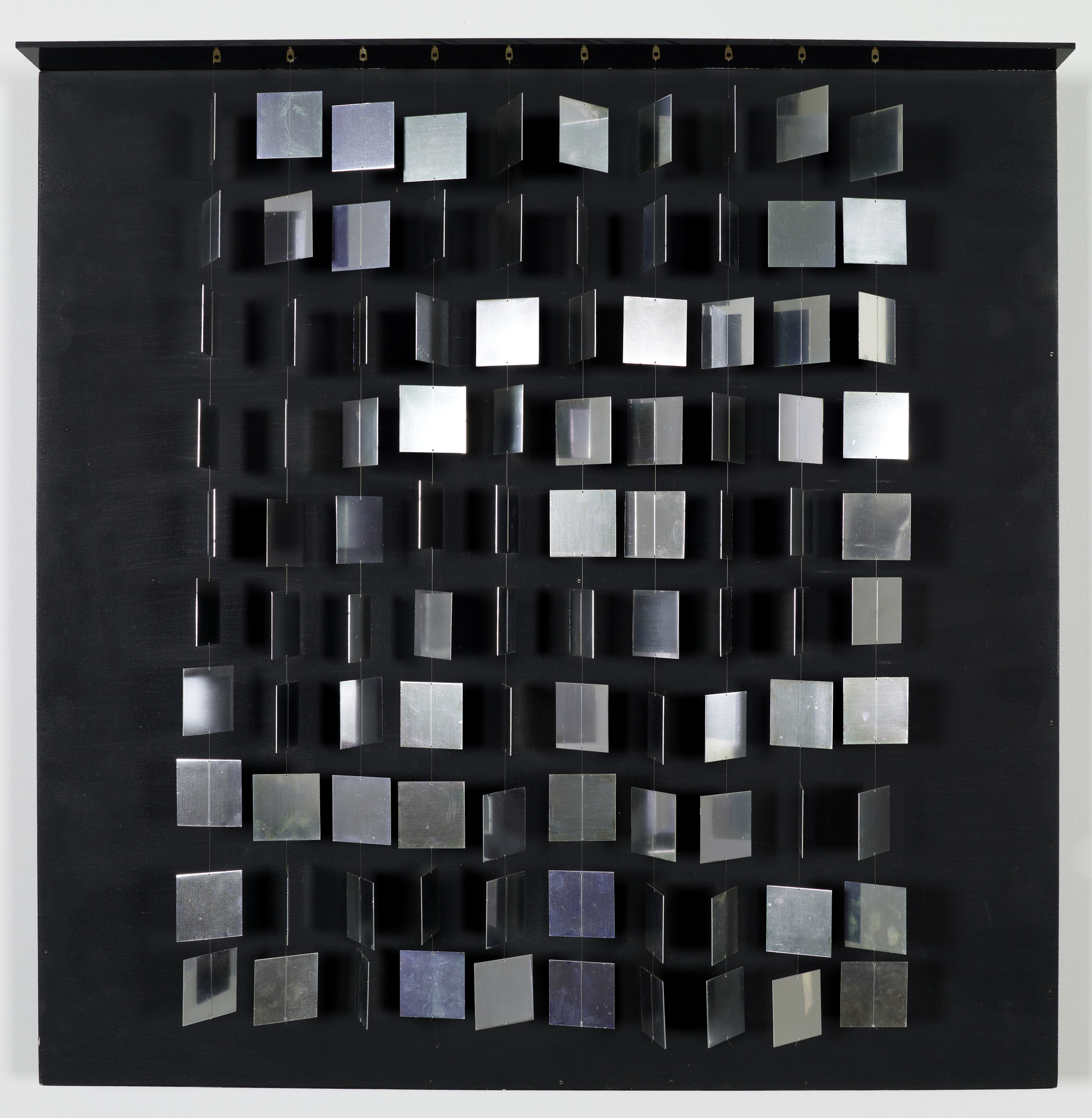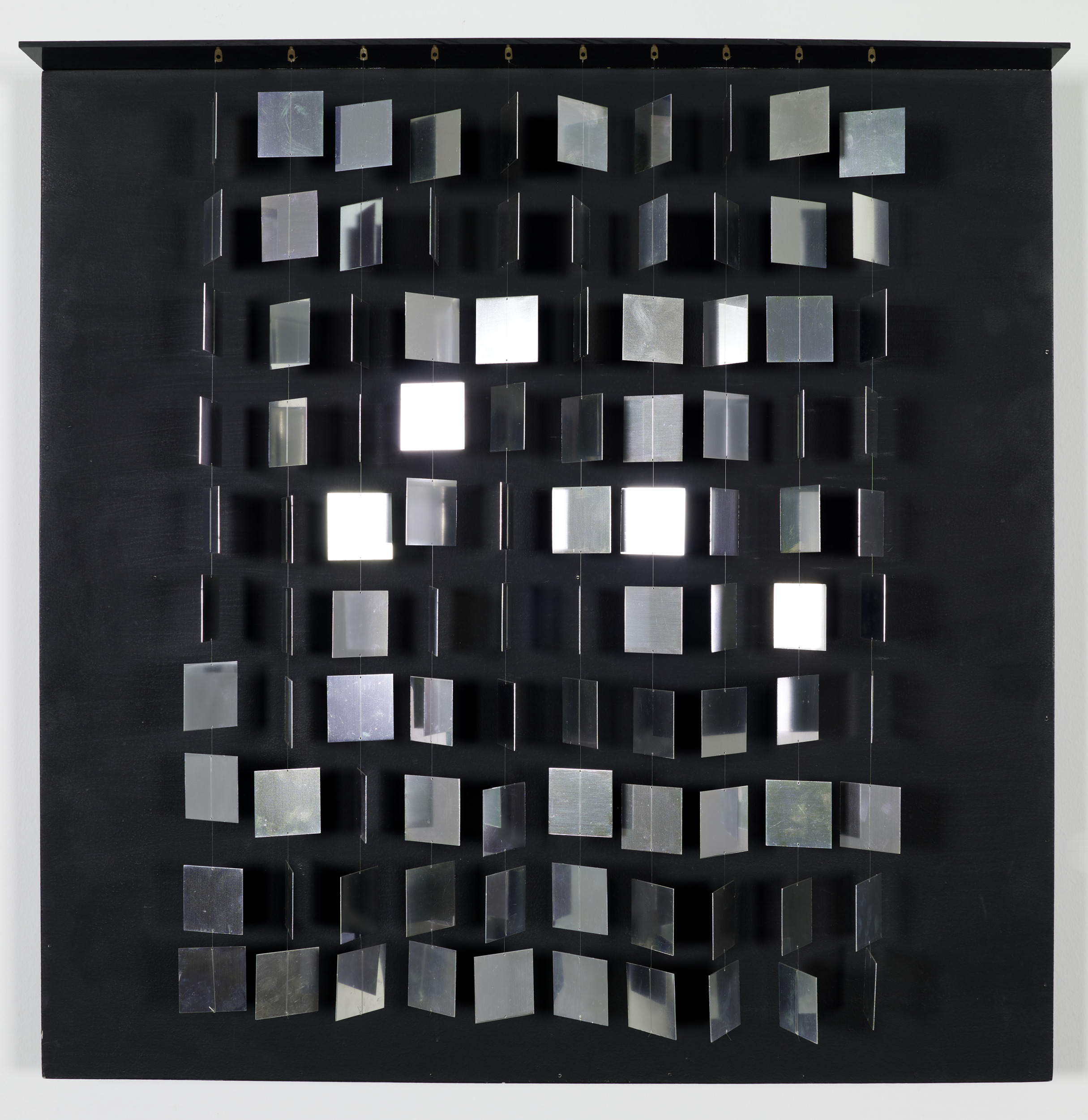 During the 1950s, Julio Le Parc became intrigued by the participatory possibilities of Op and Kinetic art, two movements that were in their formative years. In 1959, Le Parc relocated from Argentina to France. There he helped found the Paris-based collaborative Groupe de Recherche d’Art Visuel (GRAV) in 1961. The group brought together eleven Op and Kinetic artists, including Francesco Sobrino and Jean-Pierre Yvaral, whose work is also in the Albright-Knox's collection. Le Parc found his niche in employing light and movement to produce vibrant results that depend on viewer interaction. Unstable-continual Light is composed of highly polished metal paillettes hung on nylon thread in front of a black backdrop. The slightest air disturbance causes a significant degree of interplay among these elements, which also reflect their surroundings to create a brilliantly random play of light and shadow.
