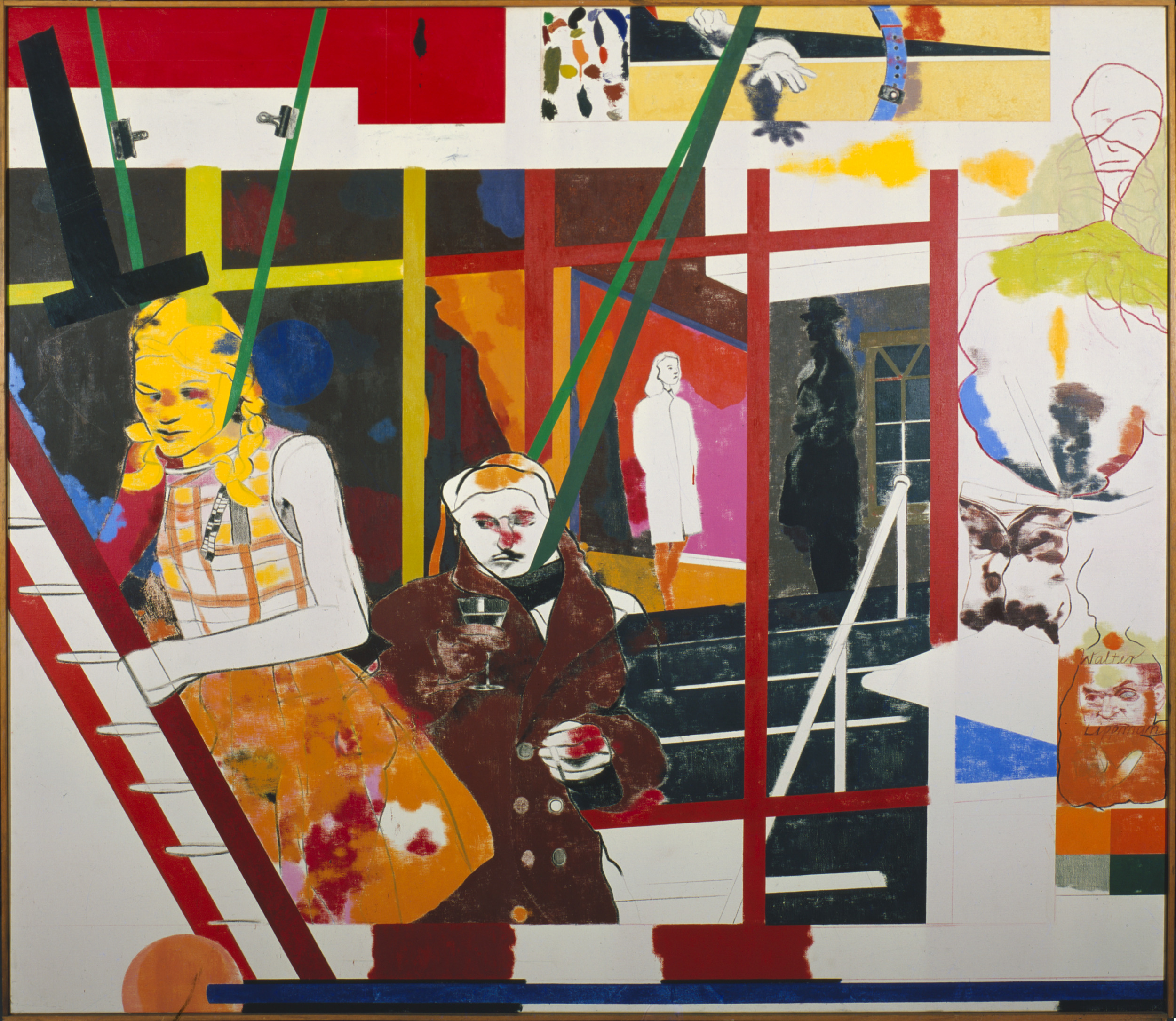 Walter Lippmann (1889–1974) was an American writer and political commentator who became well known for being one of the first journalists to introduce the concept of the Cold War. However, Lippmann’s presence here is not intended to highlight matters he was connected to. Instead, R. B. Kitaj described Lippmann’s role as an interpreter, or “explainer of sorts,” similar to the narrator in Thornton Wilder’s play Our Town, who speaks from time to time to ensure that the viewer understands what is going on. The painting is also an experiment in space and a masterful example of Kitaj’s ability to push the boundaries of the picture plane by building on a labyrinth of painterly, collage-like, linear interjections. The vivacious, colorful lines throughout the work carry the viewer’s eye to each scene, or act, but also serve as a metaphor for physical and psychological fragmentation between the painting’s characters. In a letter about this work dated July 1968, Kitaj said, “Let me say at once that Walter Lippmann is just about my favorite among the very few pictures I’ve made which I care for at all.”