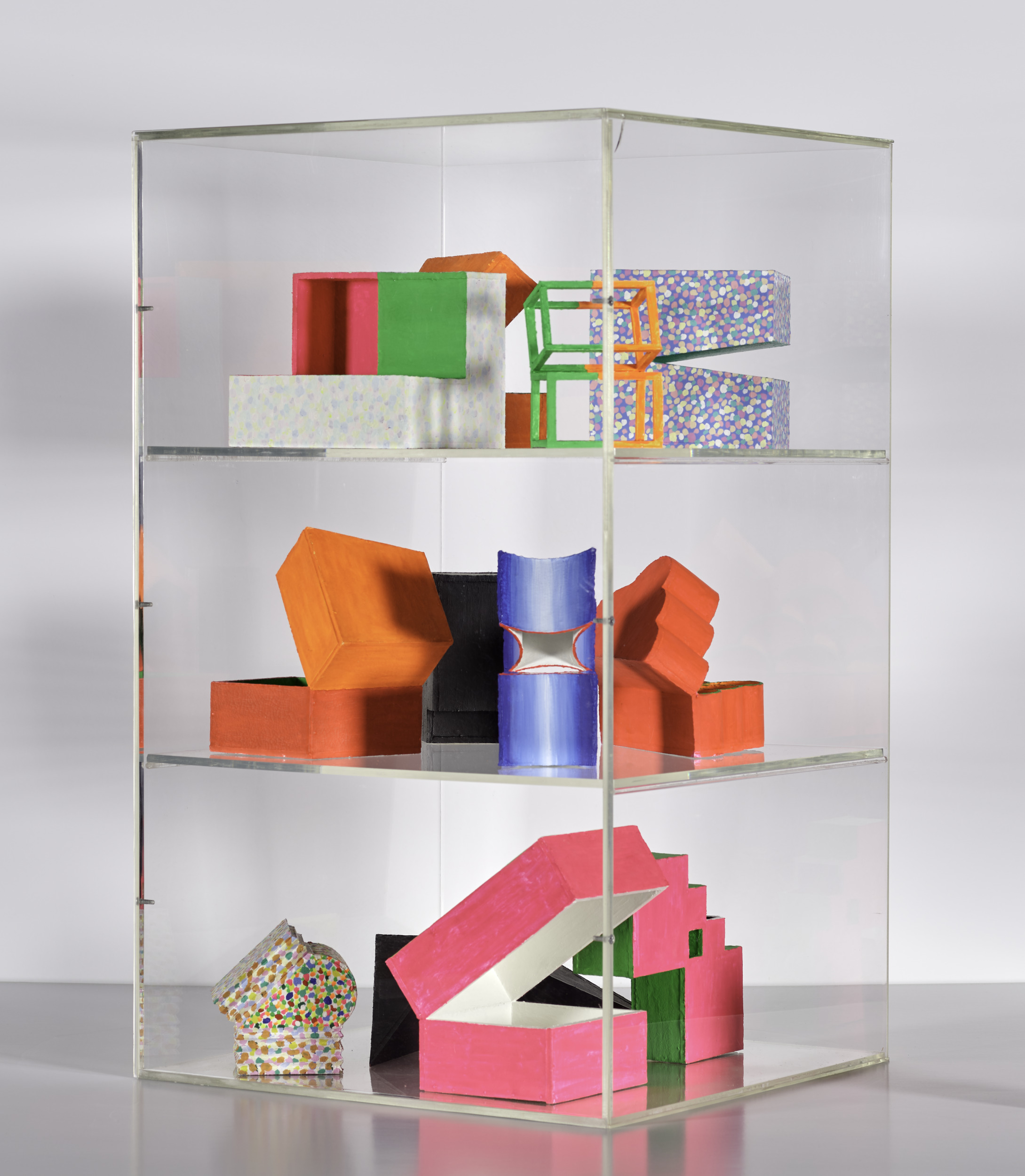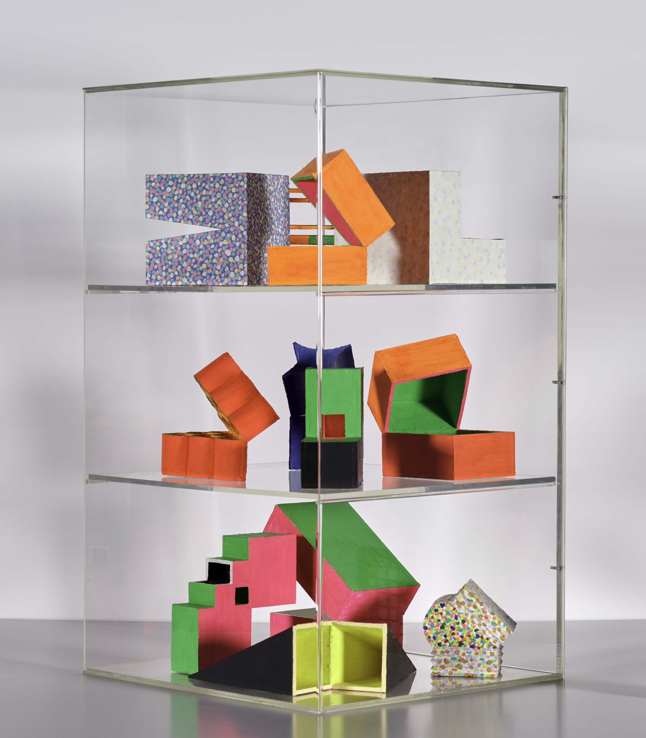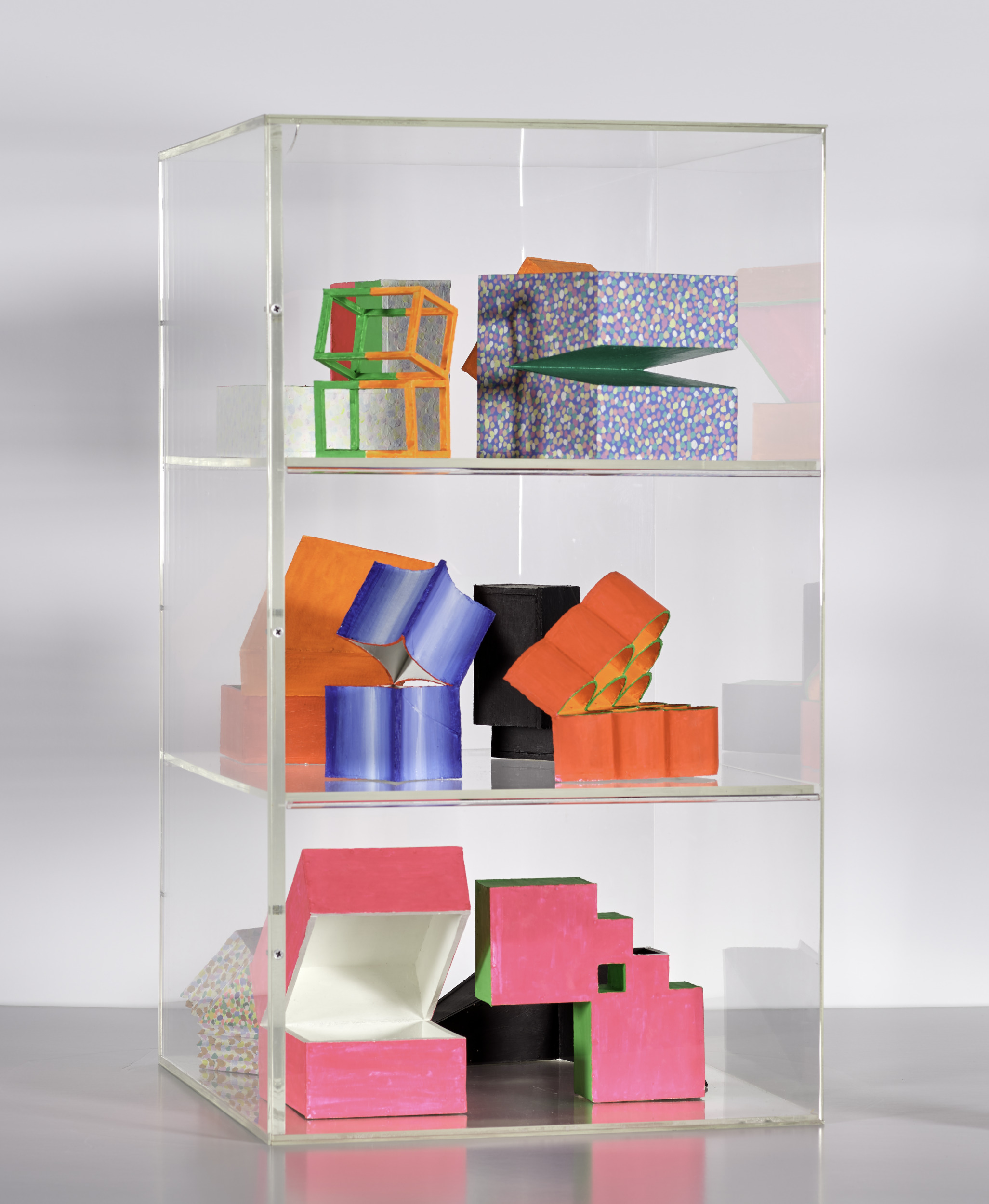 twelve painted cardboard boxes in Plexiglas case with Formica base