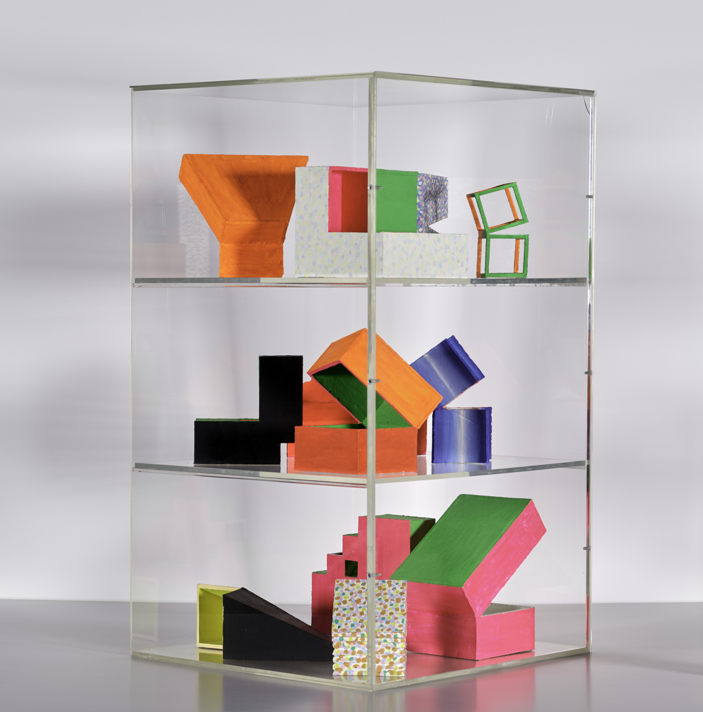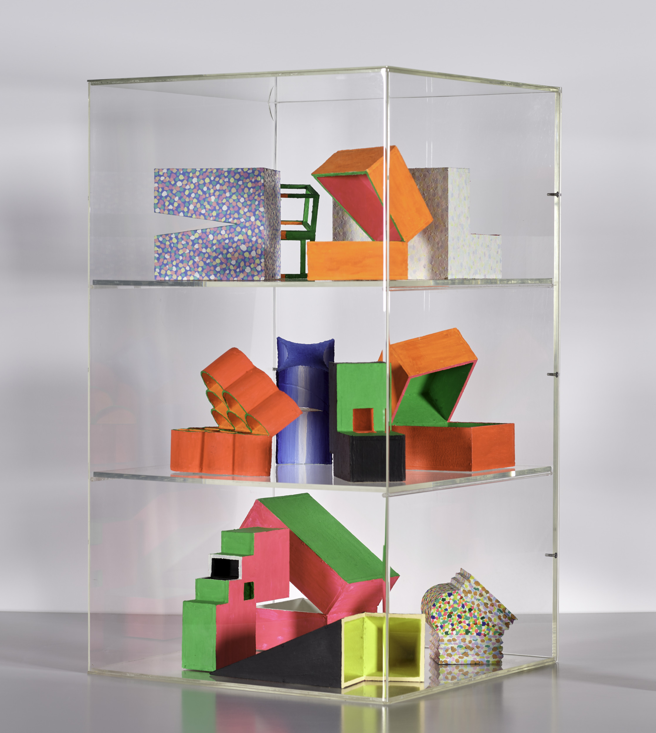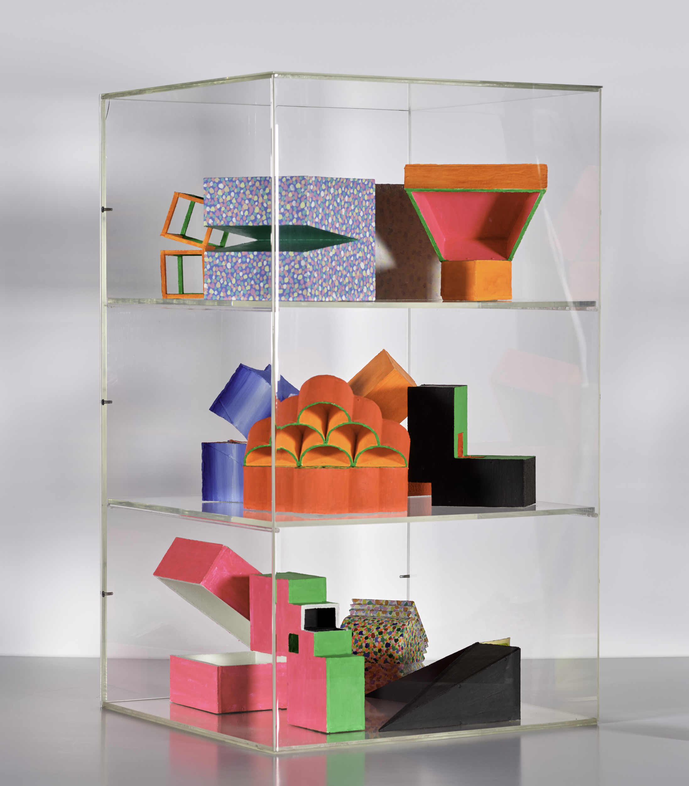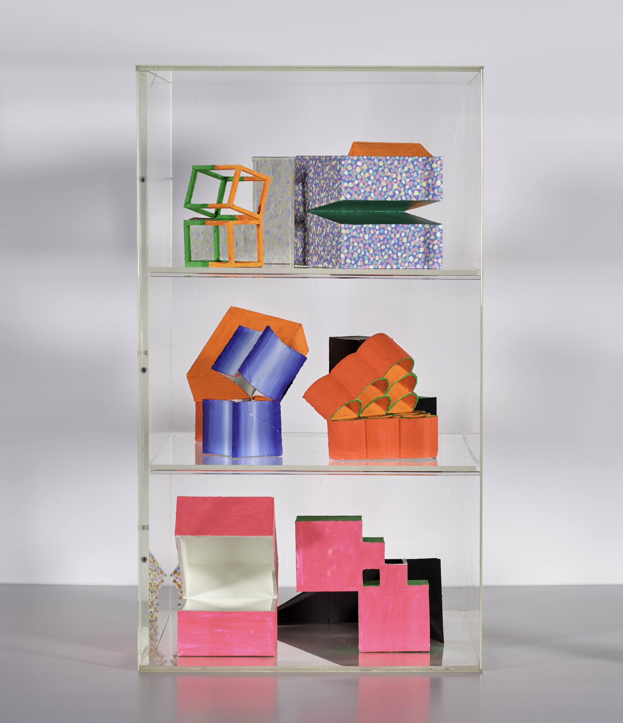 twelve painted cardboard boxes in Plexiglas case with Formica base