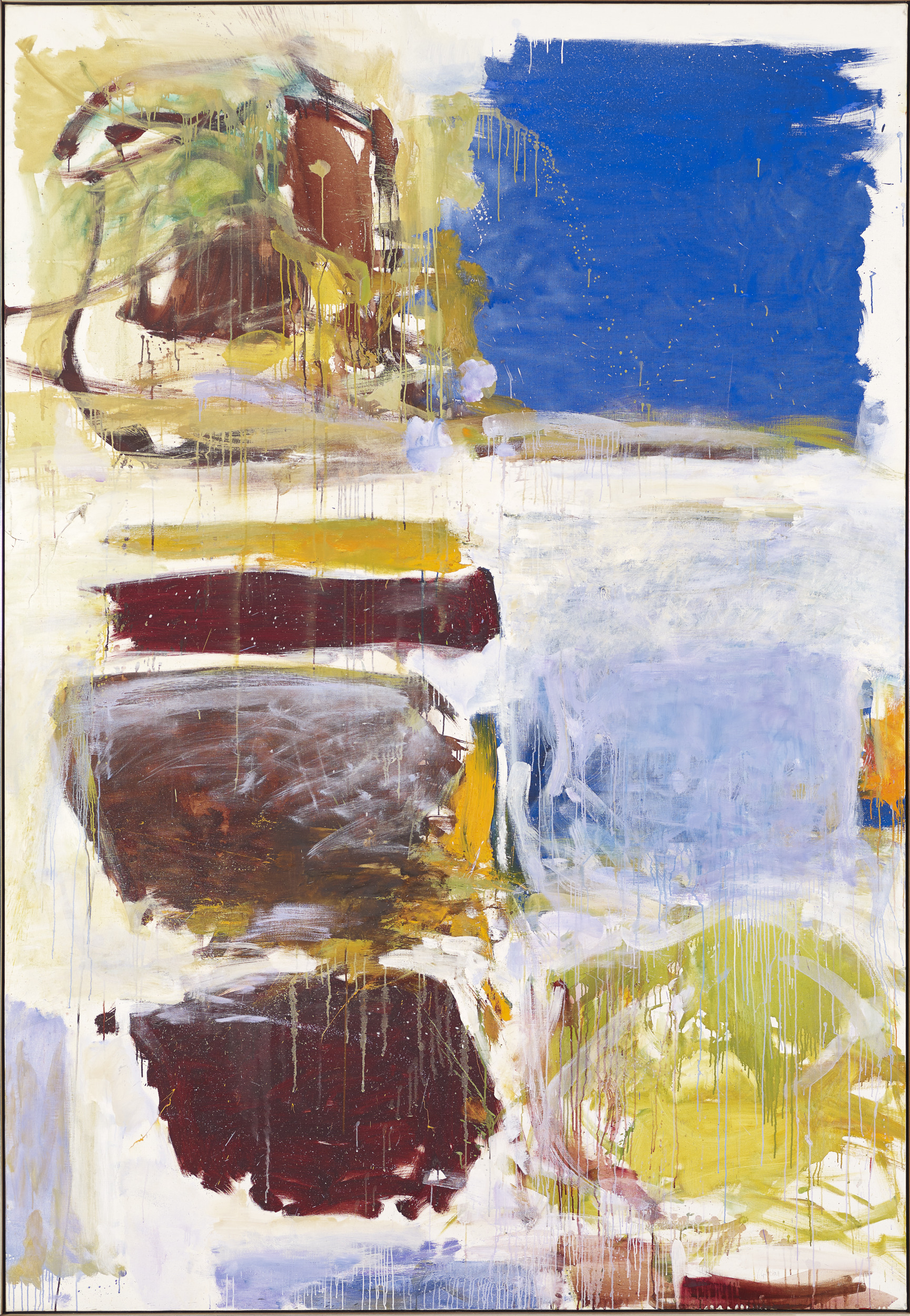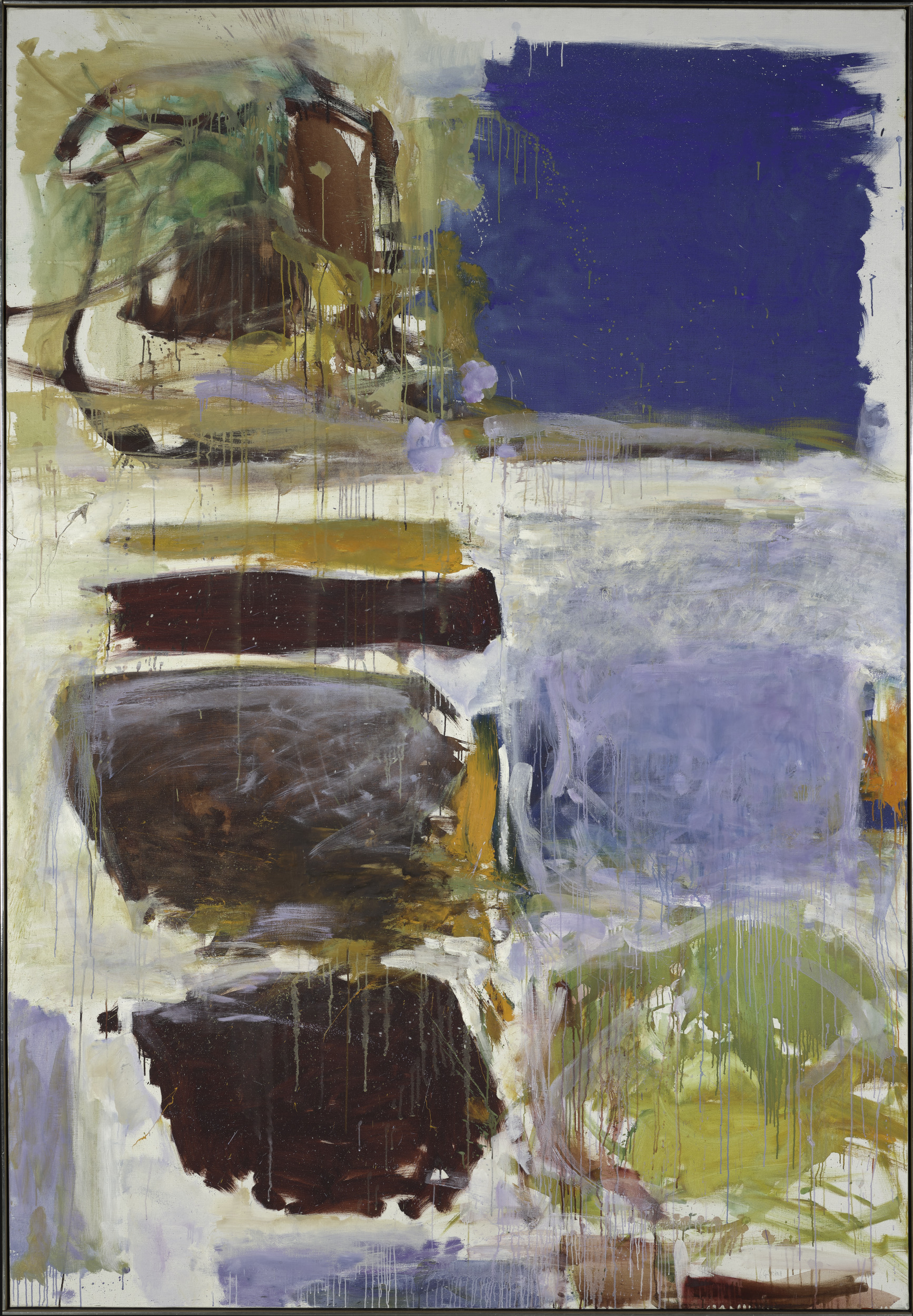 In 1955, Joan Mitchell began dividing her time between New York and France. She settled in Vétheuil, a small countryside town outside of Paris, in 1968 and continuously worked there until the end of her life. Impressionist Claude Monet lived and painted in this same quiet and serene location during the late 1870s. Inspired directly by Mitchell’s sense of place in Vétheuil, Blue Territory is part of her “Fields” series painted between 1971 and 1972. Here, Mitchell divided her canvas into rectangular areas of color. However, the overall composition essentially reads as a landscape. The artist has said of her work, “It comes from and is about landscape, not about me.” Throughout this composition, Mitchell built up areas of pigment—some applied in glossy, thick layers, others dissolving in thin veils and drips. Despite the richness of Mitchell’s brushwork, the gravitational pull on dribbles of paint lends this sizeable tableau a stable and somewhat serene air.