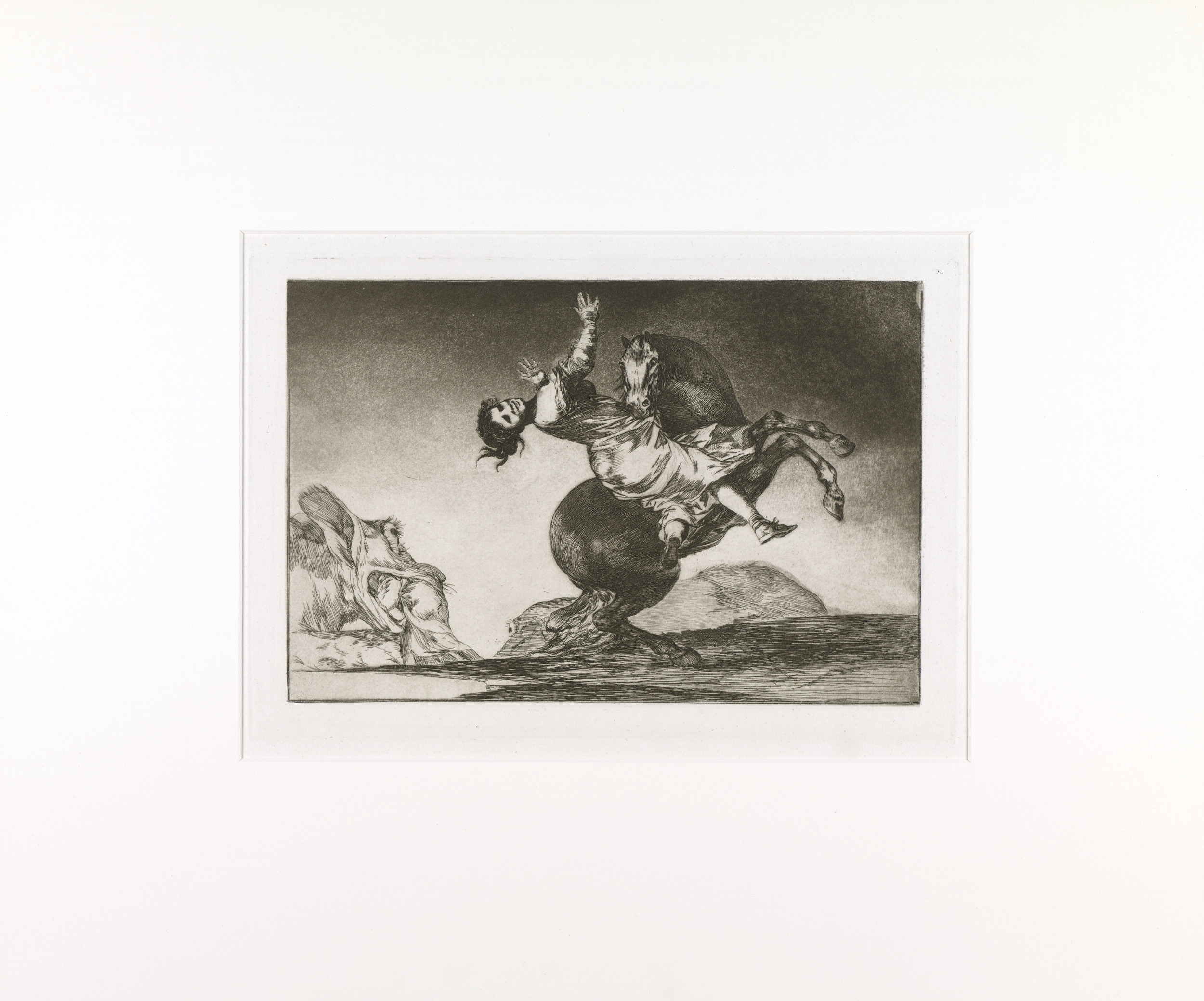 Between 1819 and 1823, Francisco de Goya produced a group of twenty-two prints of dark and unsettling satires. A woman and a horse—let someone else master them is based on a story in which a man is turned into a horse and, subsequently, falls in love with a married woman. His jealous rage drives him to kill her husband and abduct her. Here, Goya portrays the man-turned-horse reared on his hind legs with the woman flailing from his mouth. It is a scene of untamed power and unbridled passion. This already disconcerting tale takes place in a surreal, even grotesque landscape. What at first appear to be mountains are actually rodent-like creatures—one wide-eyed and poised for attack, the other devouring what may be the remains of the woman’s husband.