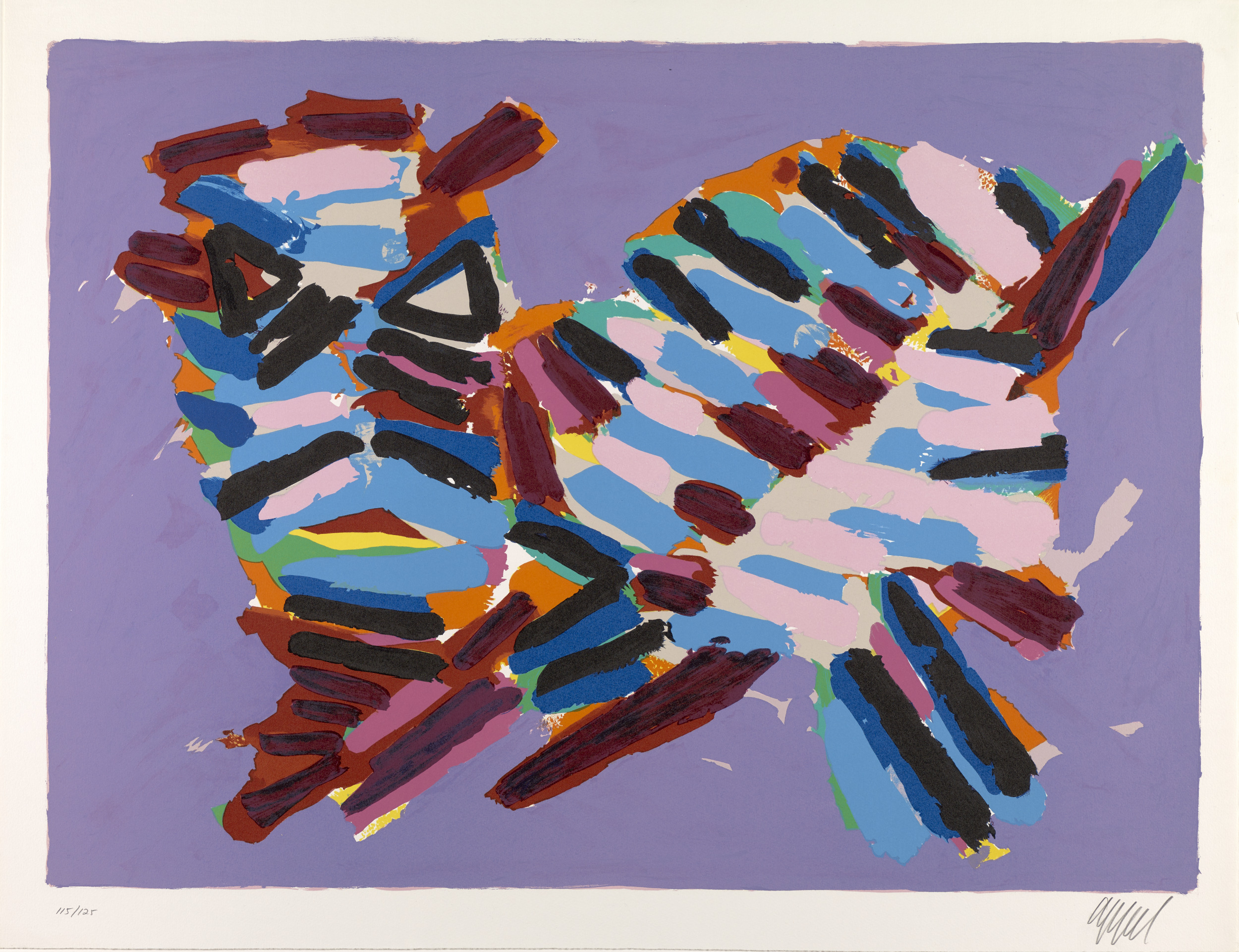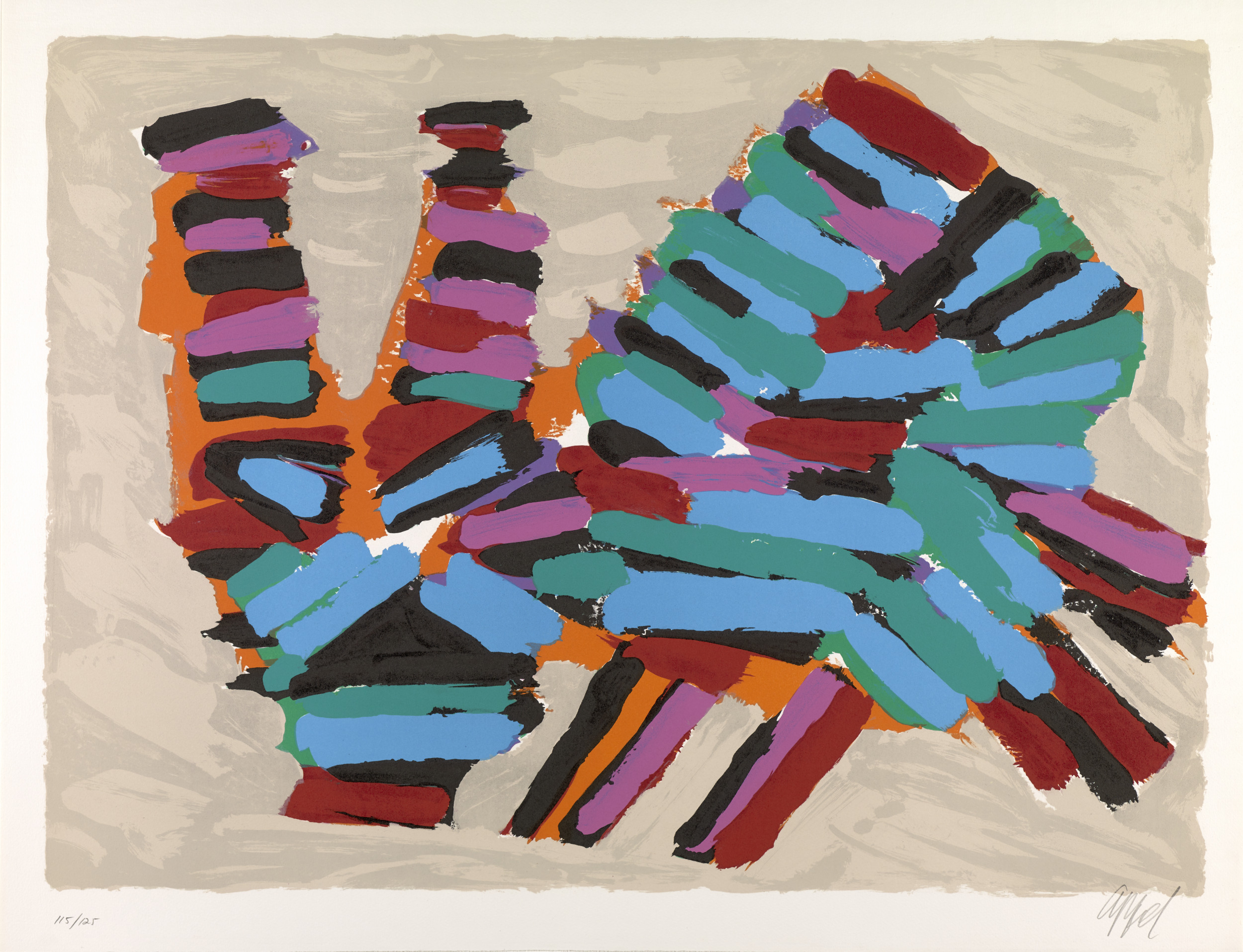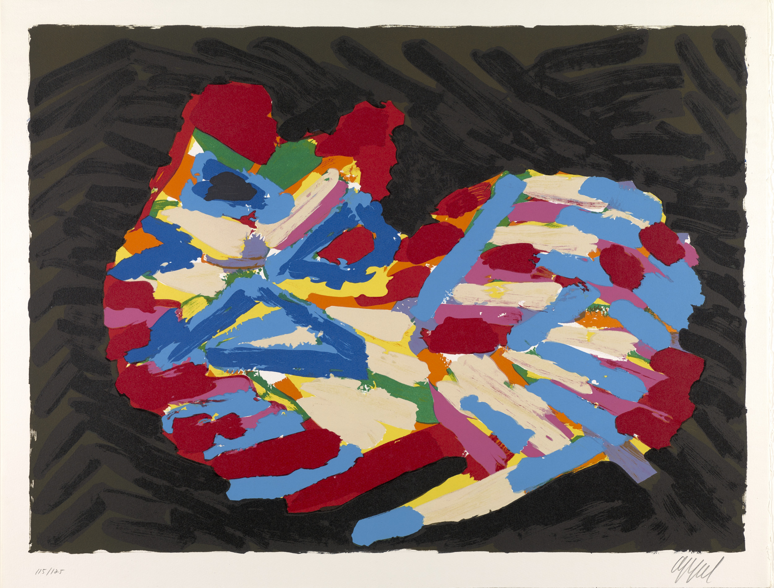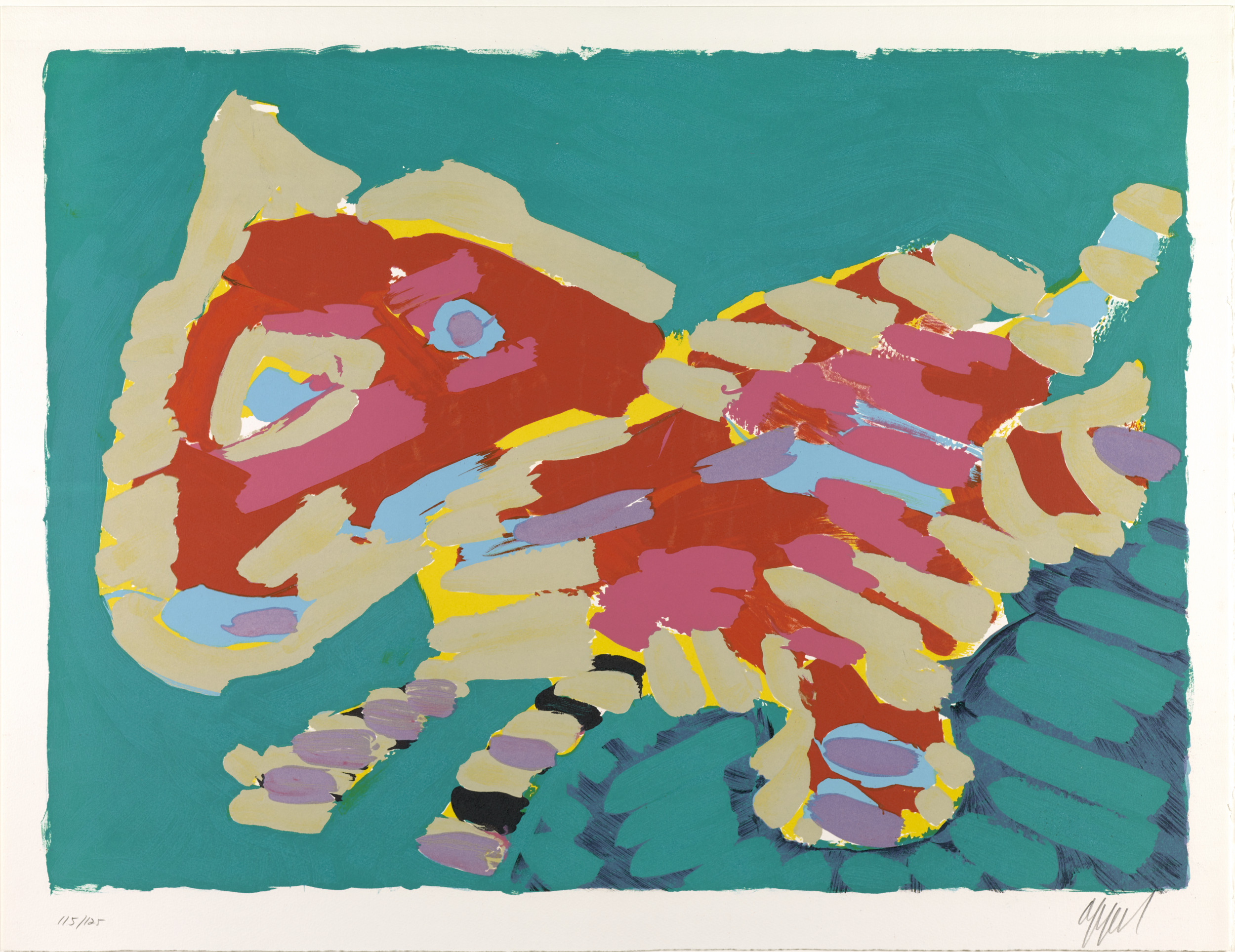 Karel Appel was a founding member of CoBrA, a group of European avant-garde artists who, in the wake of World War II (1939–45), rejected the formal aspects of traditional artmaking. They instead embraced the raw energy of child-like imagery, vivid colors, and expressive brushstrokes. The group’s name is a combination of the first letters of the members’ cities of residence: Copenhagen, Brussels, and Amsterdam. Although CoBrA was only officially active from 1948 to 1951, Appel’s interest in many of these traits continued throughout his career. He admired the domestic house cat for its aloof, yet instinctive, demeanor, and it became one of his favorite subjects. The portfolio Cats is a visual meditation on the animals’ behavior in which the artist depicts them resting, walking, stalking, frightened, and poised to attack.