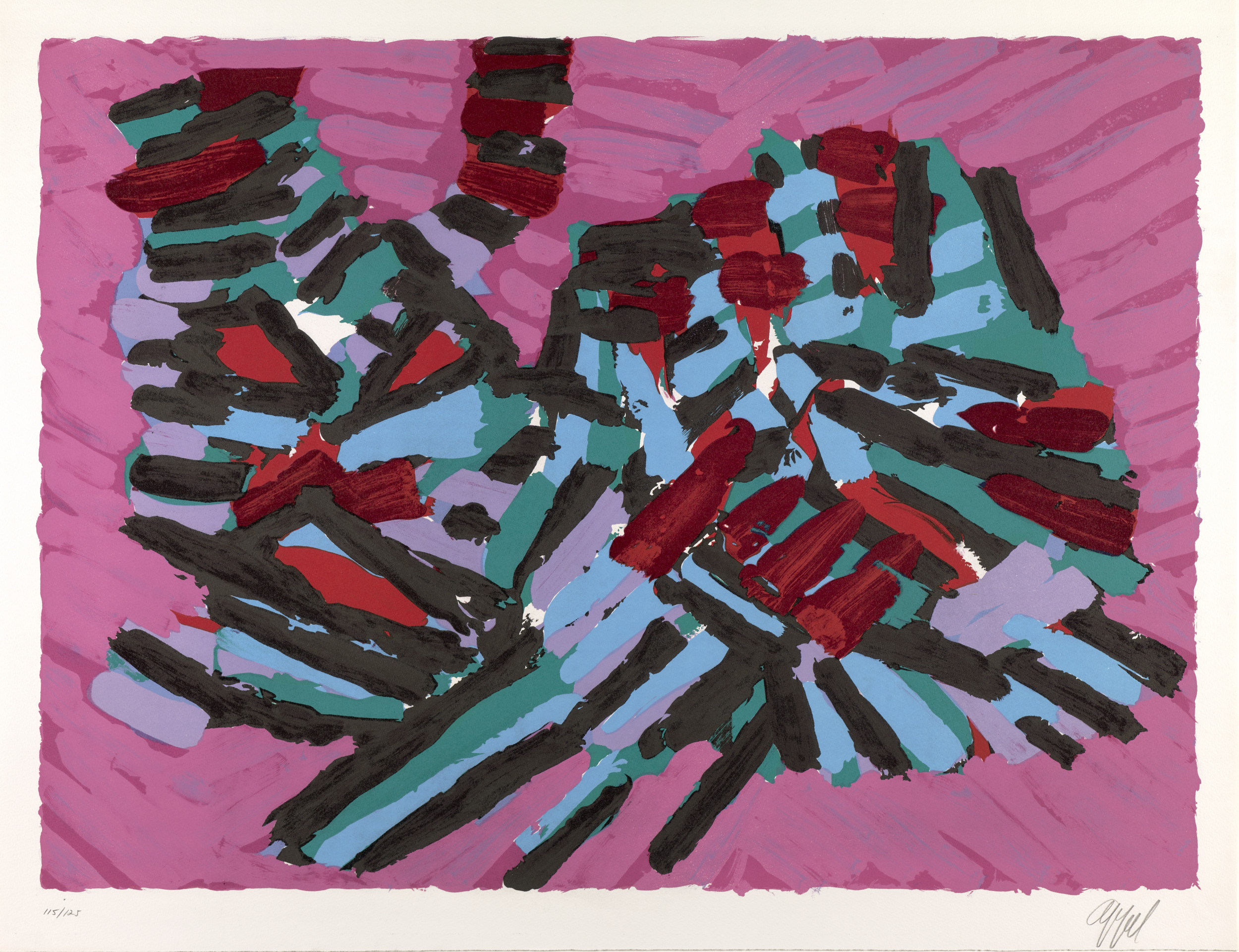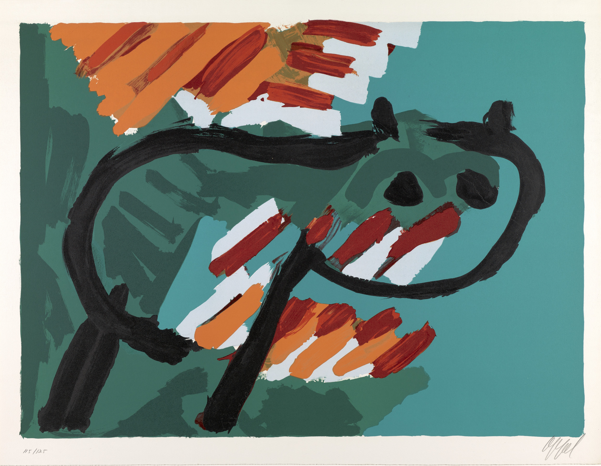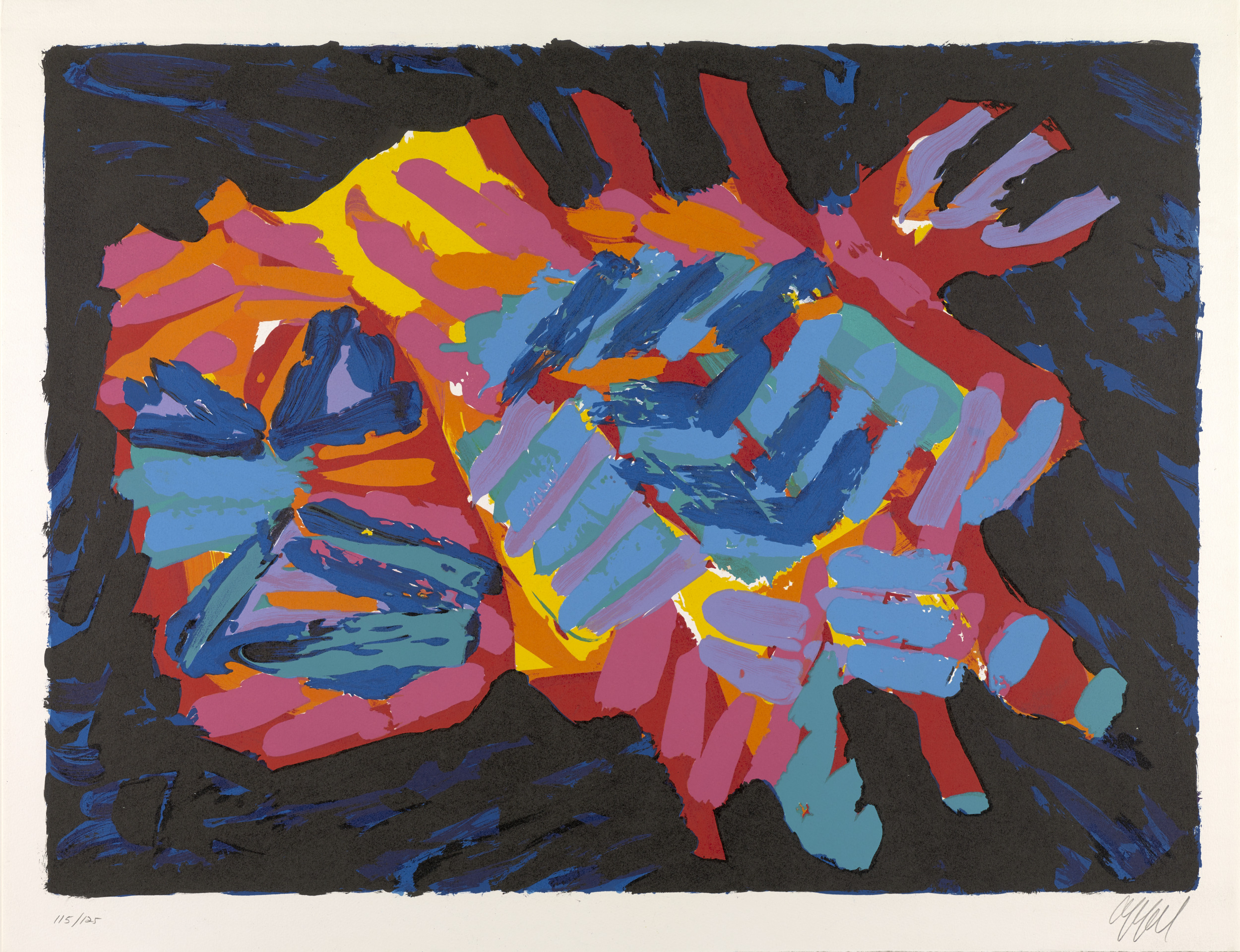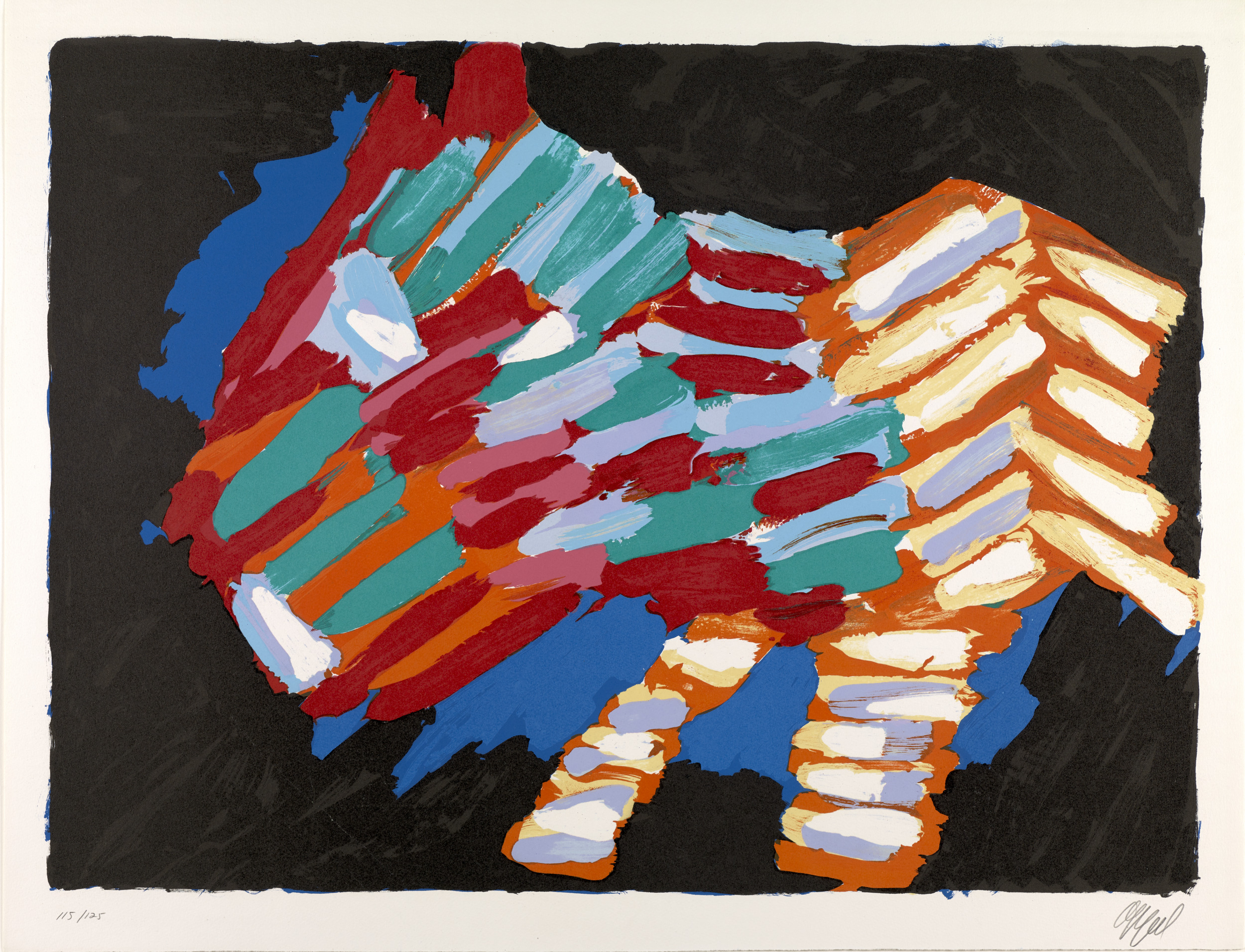 Karel Appel was a founding member of CoBrA, a group of European avant-garde artists who, in the wake of World War II (1939–45), rejected the formal aspects of traditional artmaking. They instead embraced the raw energy of child-like imagery, vivid colors, and expressive brushstrokes. The group’s name is a combination of the first letters of the members’ cities of residence: Copenhagen, Brussels, and Amsterdam. Although CoBrA was only officially active from 1948 to 1951, Appel’s interest in many of these traits continued throughout his career. He admired the domestic house cat for its aloof, yet instinctive, demeanor, and it became one of his favorite subjects. The portfolio Cats is a visual meditation on the animals’ behavior in which the artist depicts them resting, walking, stalking, frightened, and poised to attack.