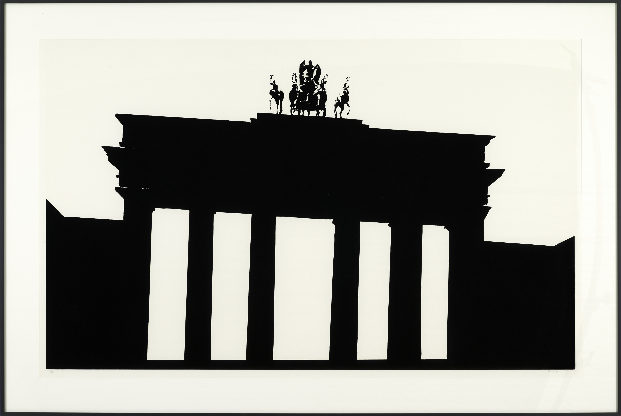 One of the cofounders of the Buffalo nonprofit art center Hallwalls, Robert Longo is known for his works on paper—typically large-scale drawings of loaded subject matter rendered with intense black tones. Here, Longo’s subject is the Brandenburg Gate, the famous eighteenth-century monument to German unification later adopted as a symbol of the Nazis; but he does not celebrate it as much as question how and what it represents. By drawing the white marble structure in a black silhouette, he suggests the perversity of using elements from the classical architecture of ancient Greece and Rome—long associated with power, but also democracy and the equality of people—to symbolize twentieth-century fascism. In a 1984 interview, Longo explained his motive: “I watch the visual mechanisms of culture, which are so sophisticated—the way the Nazis turned Germany into a Nazi state, for example. That is like child’s play compared to the mechanisms that exist now to turn this country into something quite horrific. So one of the things about the artist, what the artist has to do, is that he has to be like a policeman. A great deal of my art . . . is about blowing the whistle on society.”