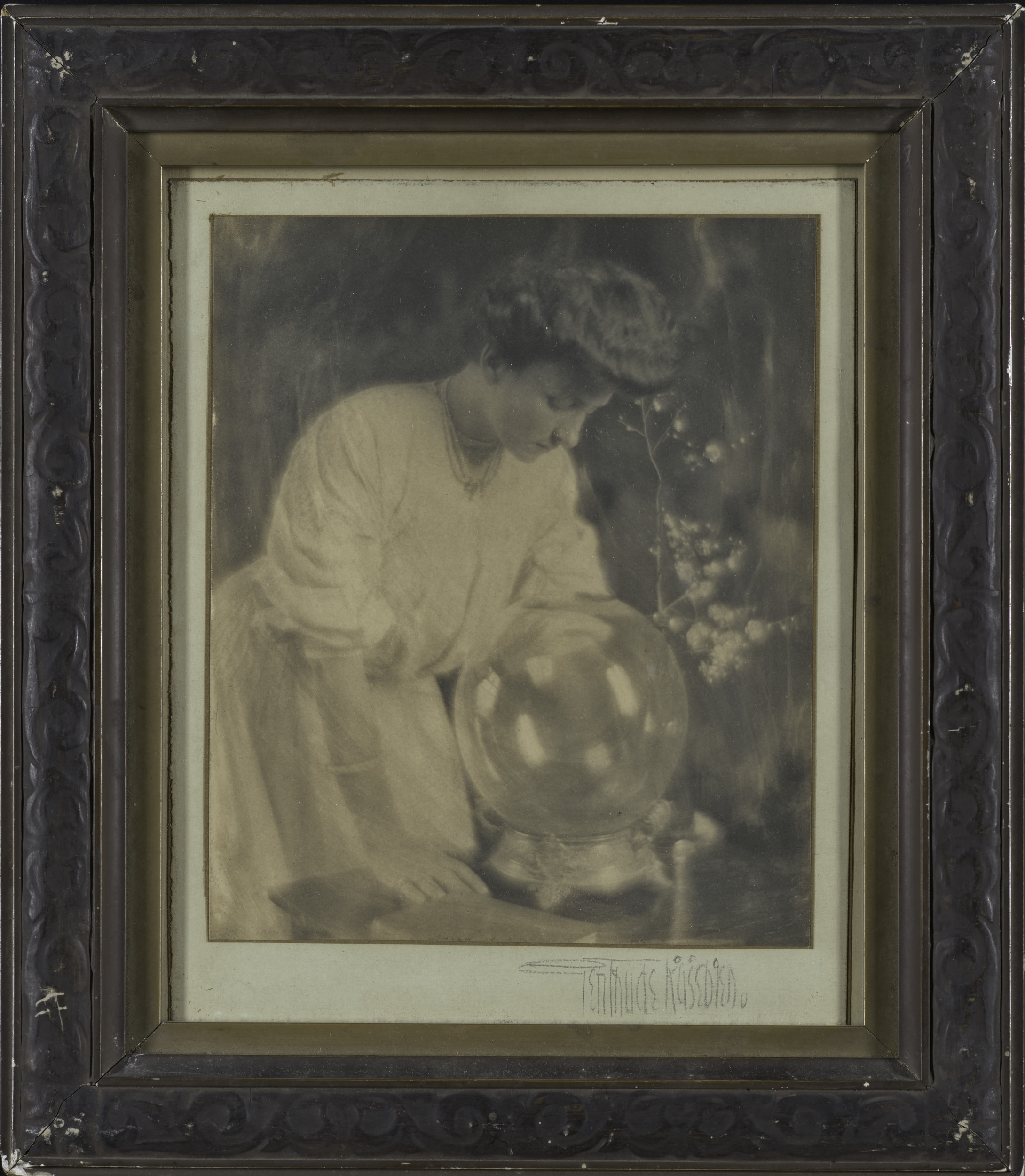 Charlotte S. Albright looking into a glass bowl or ball, not dated