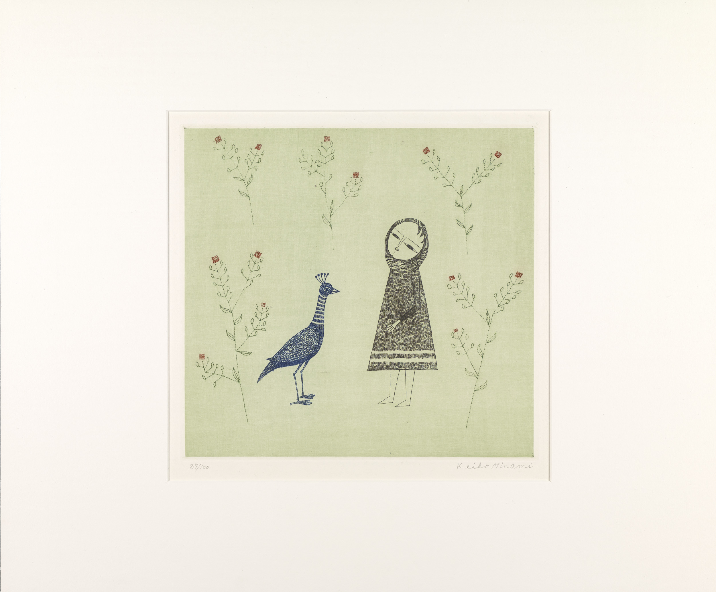 Keiko Minami (Japanese, 1911–2004). Small Girl with Bird, ca. 1950s. Etching, edition 27/100; 15 x 20 1/2 inches (38.1 x 52.1 cm). Collection Albright-Knox Art Gallery, Buffalo, New York; Gift of Frederic P. Norton, 1999 (P1999:6.399). © Estate of Keiko Minami.