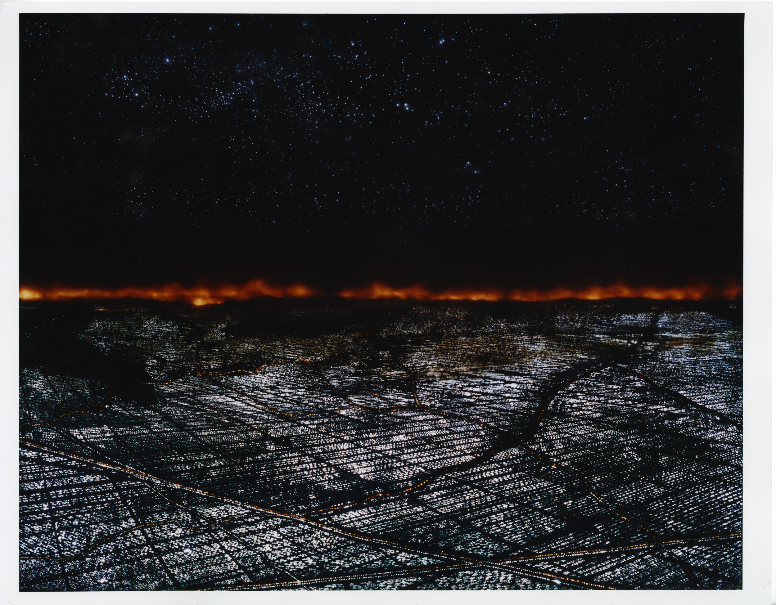 Positioning herself the intersection of fantasy and reality, Sonja Braas constructs and photographs dioramas of ravished and catastrophe-stricken landscapes. The Quiet of Dissolution, Firestorm is from a series of images that depict natural and manmade disasters, including floods, fires, snowstorms, landslides, and oil spills. To create this nocturnal view of the city of Los Angeles consumed by flames, the artist photographed a strategically lit maquette that she later destroyed. Like other works from this series, The Quiet of Dissolution, Firestorm challenges our notions of reality through a fabricated image of horrific beauty.