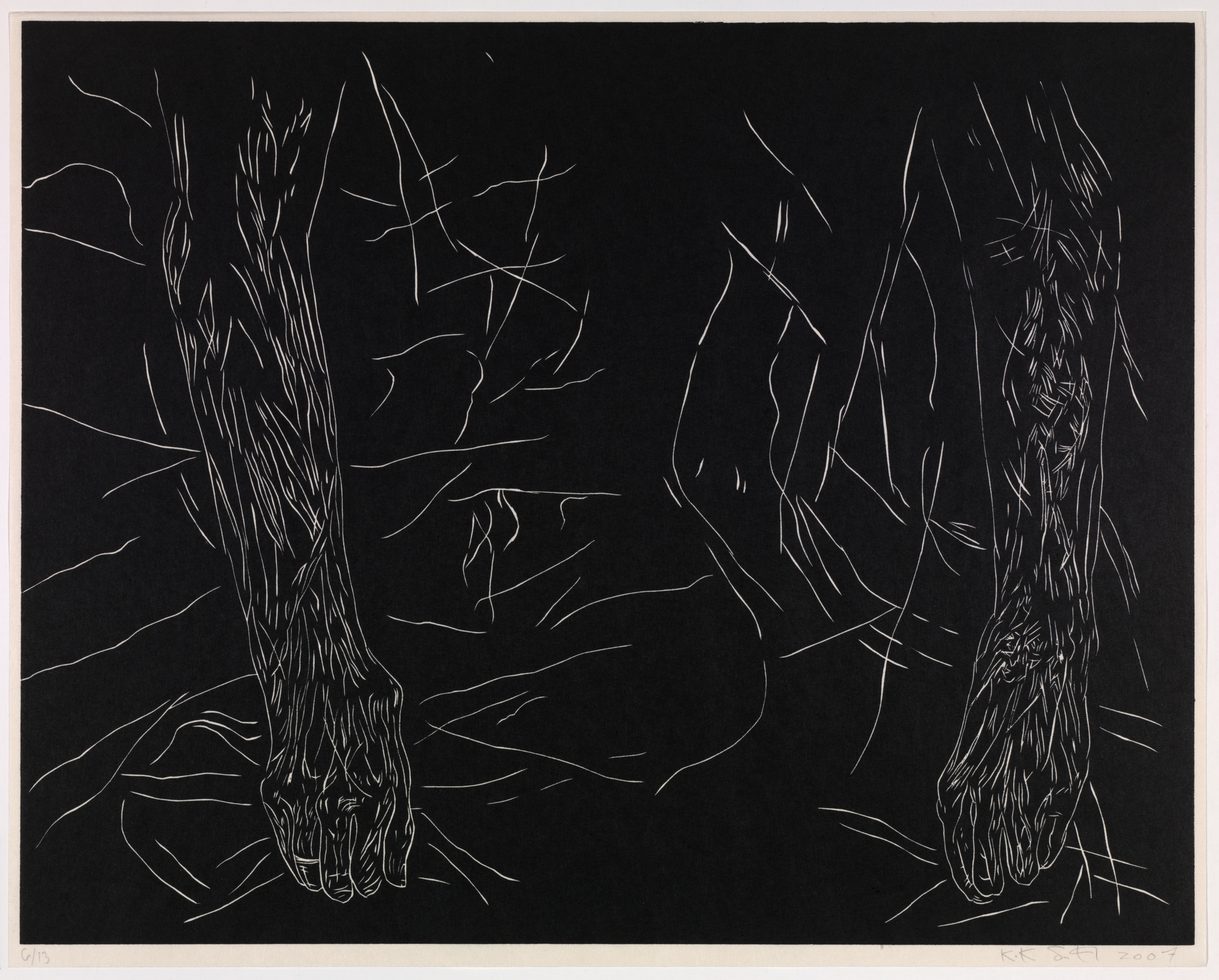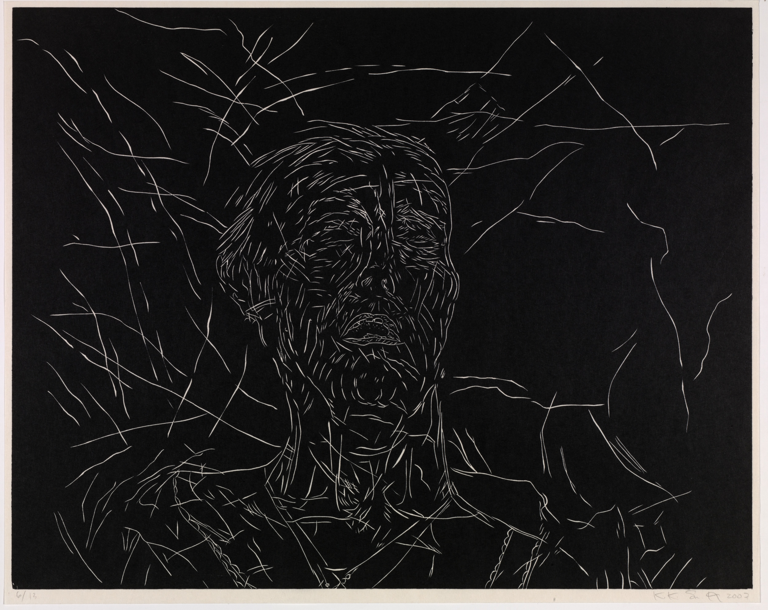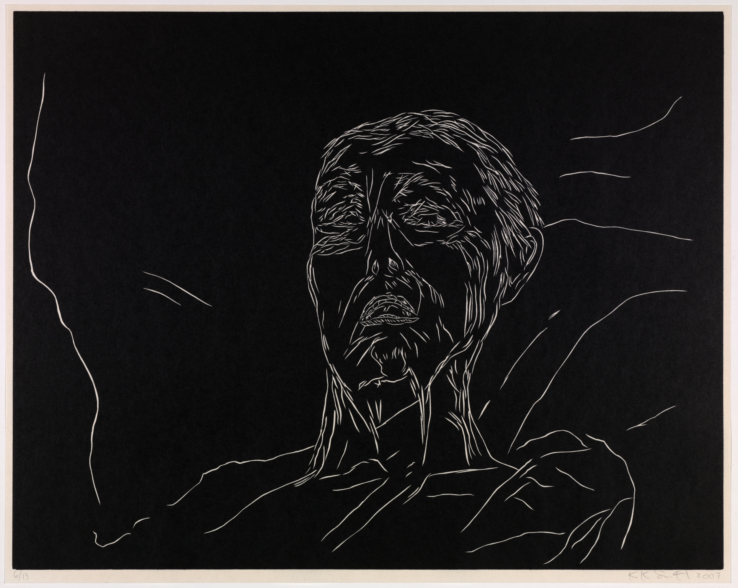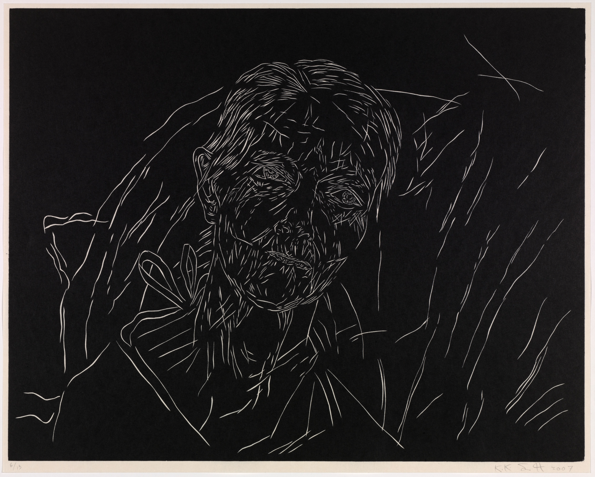 Kiki Smith’s work often explores mortality, bodily dissolution, and decay. Mortal is a series of twelve woodcut etchings recording the end of her mother’s life. The work's raw edginess recalls the numerous woodcut prints created by artists associated with German Expressionism in the first half of the twentieth century. Smith, however, has imbued her images with a delicacy that pays tribute to grief and the act of dying. The figure emerges as a negative image in fine lines from a dark ground that seems to reflect the frailty of human life in its final stages.