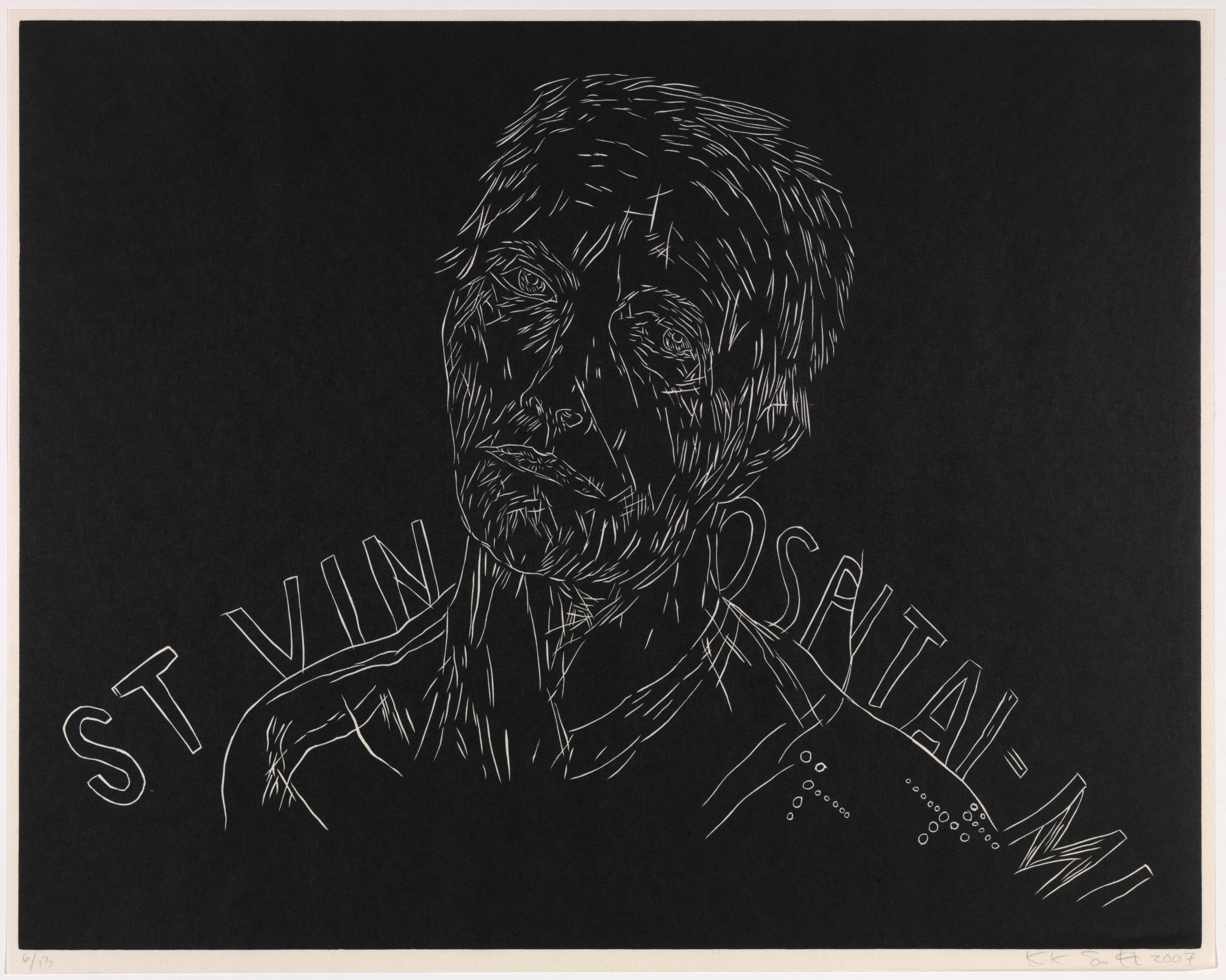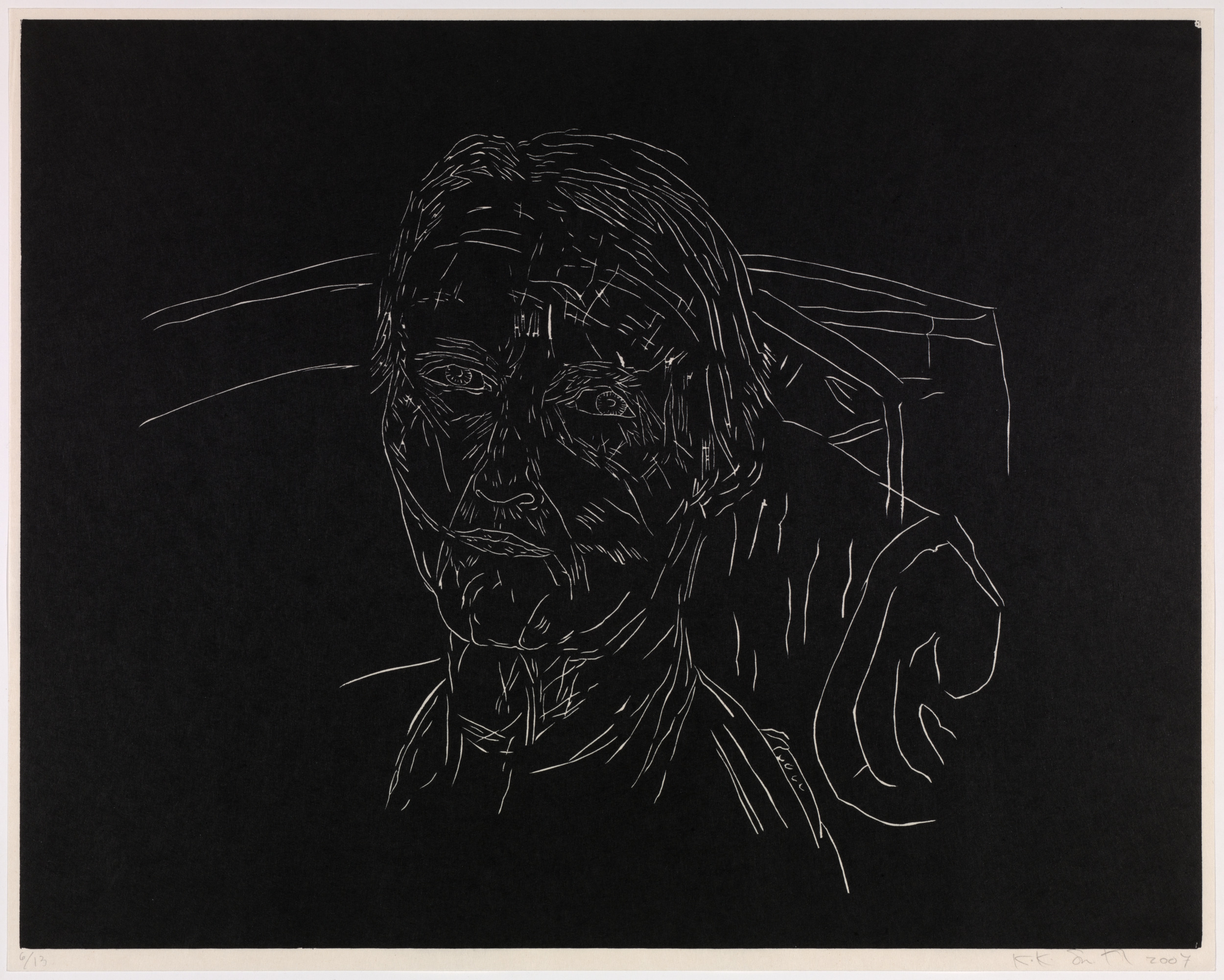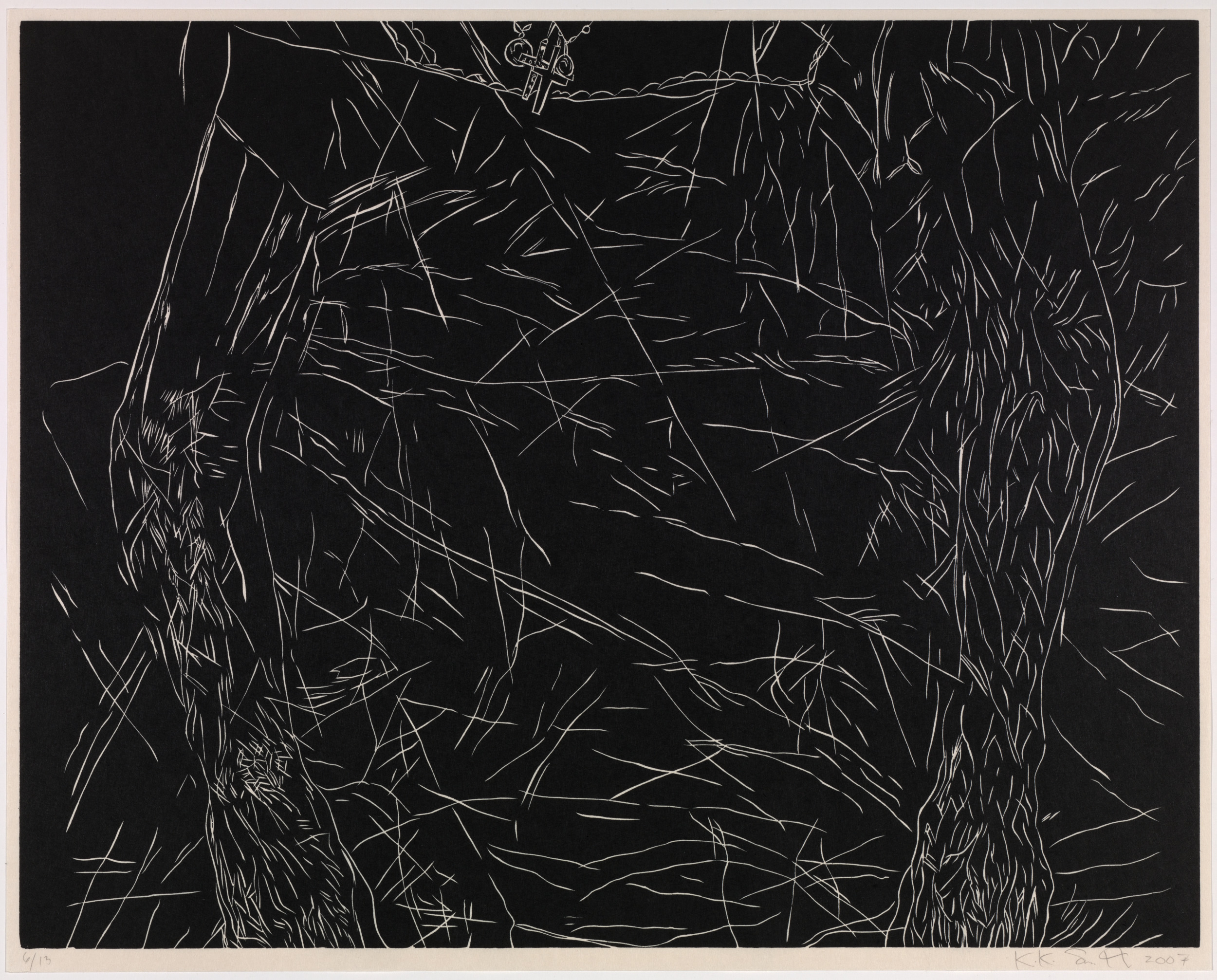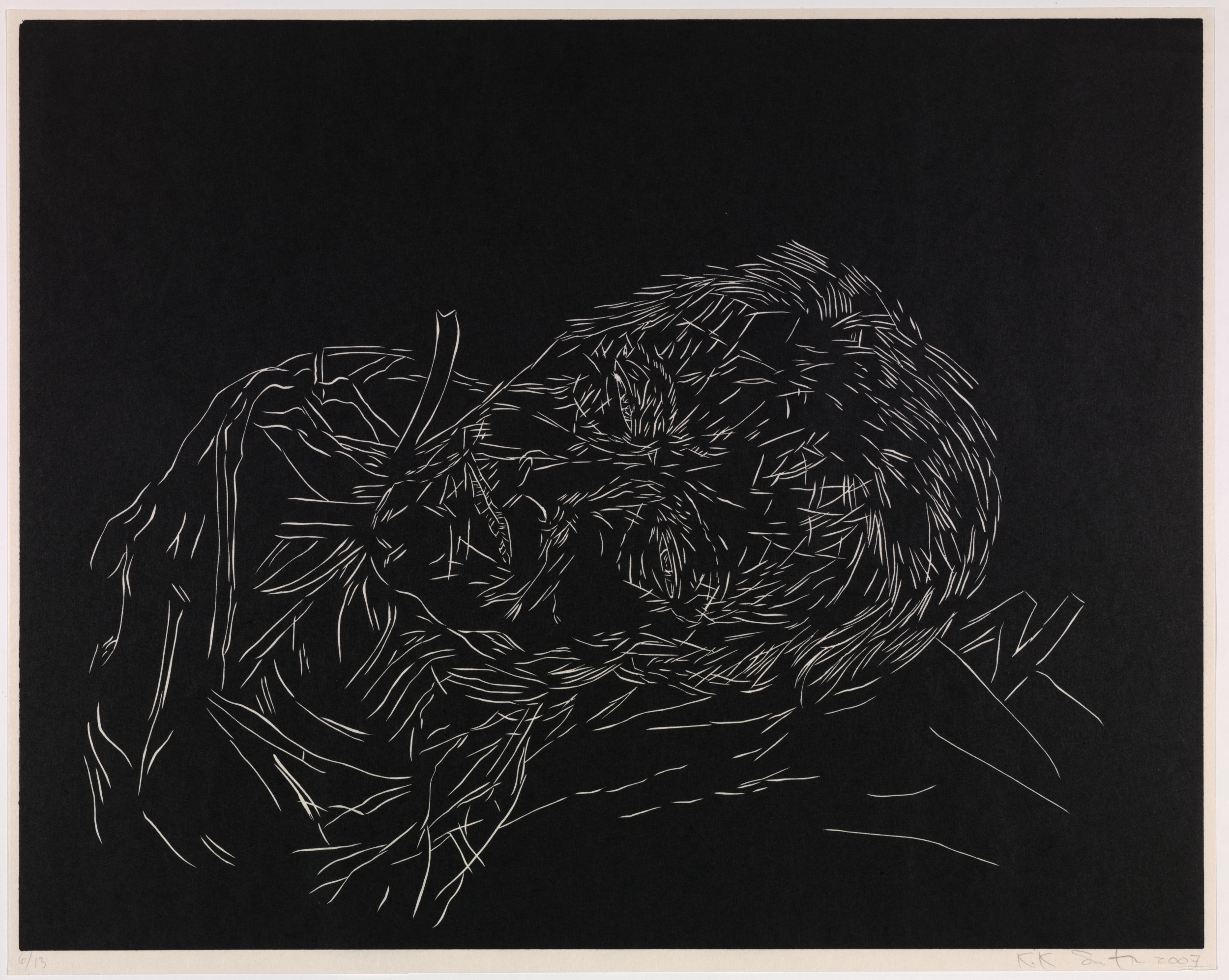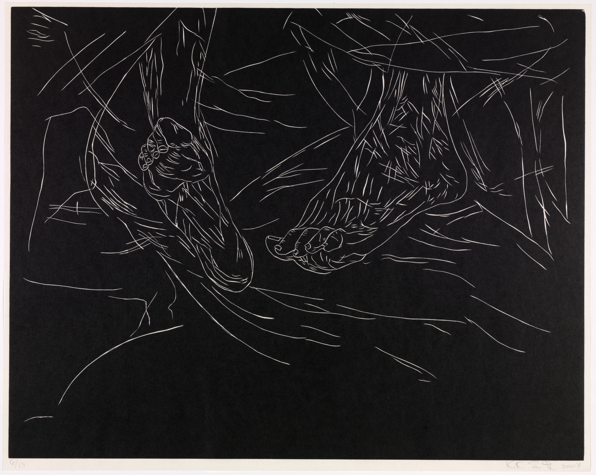 Kiki Smith’s work often explores mortality, bodily dissolution, and decay. Mortal is a series of twelve woodcut etchings recording the end of her mother’s life. The work's raw edginess recalls the numerous woodcut prints created by artists associated with German Expressionism in the first half of the twentieth century. Smith, however, has imbued her images with a delicacy that pays tribute to grief and the act of dying. The figure emerges as a negative image in fine lines from a dark ground that seems to reflect the frailty of human life in its final stages.
