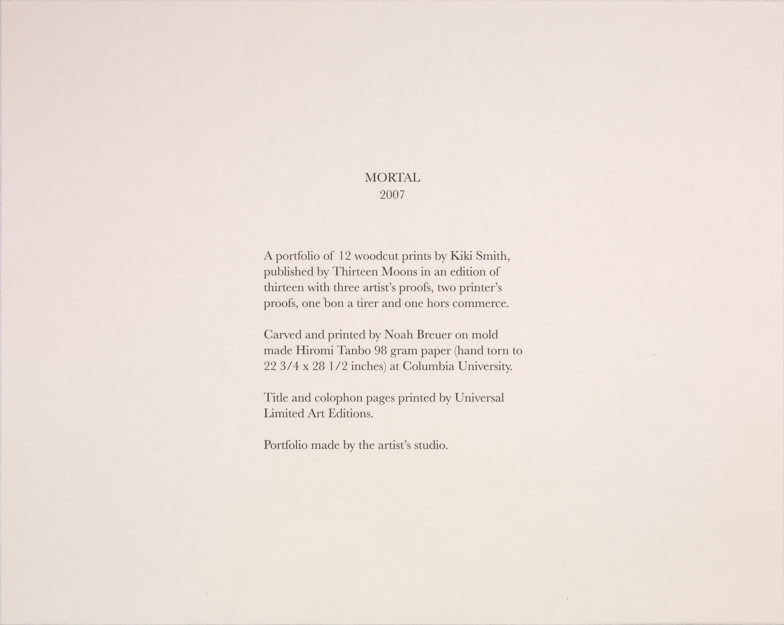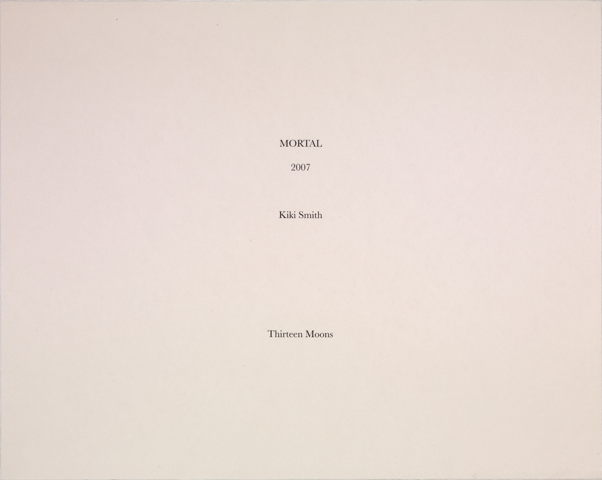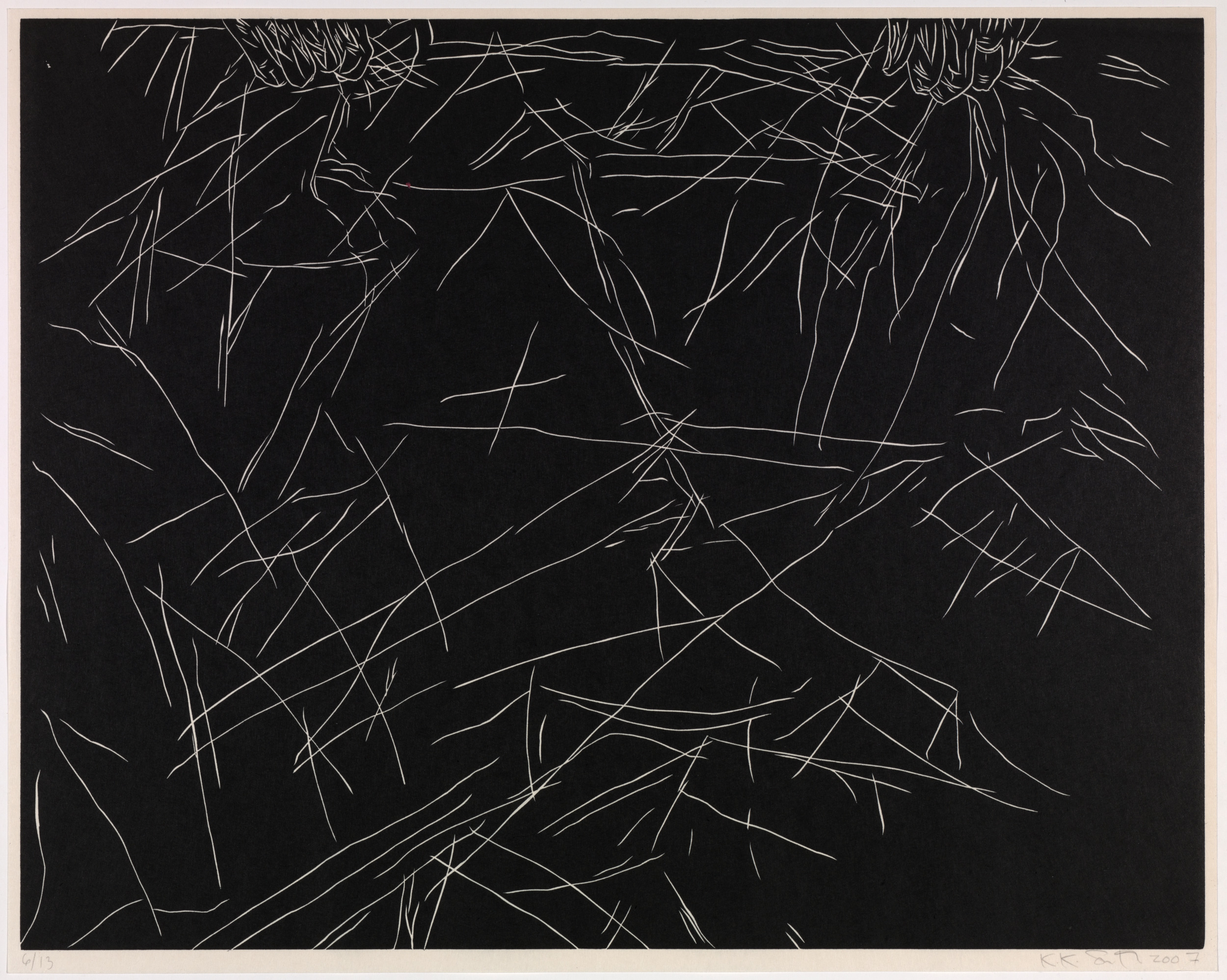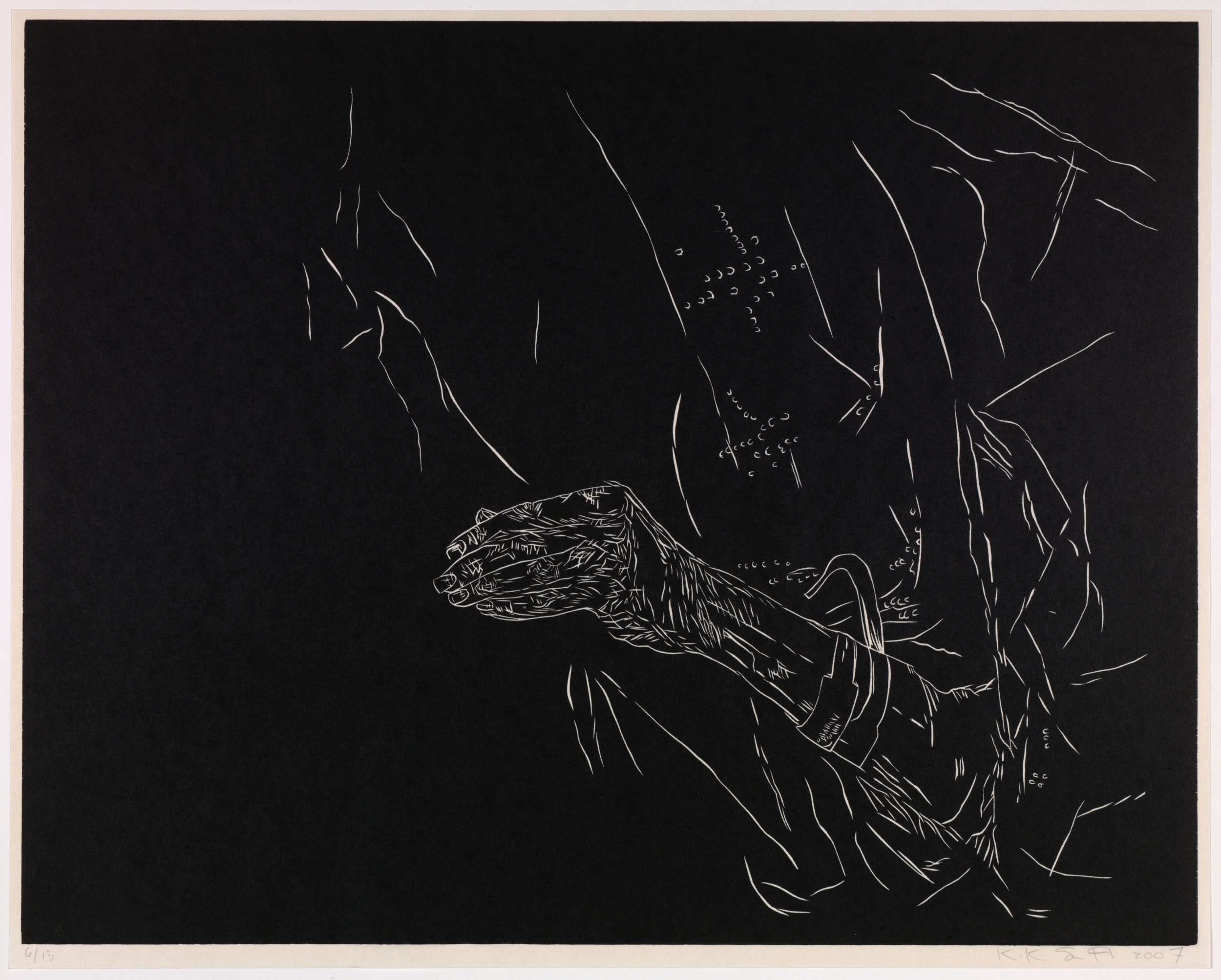 Kiki Smith’s work often explores mortality, bodily dissolution, and decay. Mortal is a series of twelve woodcut etchings recording the end of her mother’s life. The work's raw edginess recalls the numerous woodcut prints created by artists associated with German Expressionism in the first half of the twentieth century. Smith, however, has imbued her images with a delicacy that pays tribute to grief and the act of dying. The figure emerges as a negative image in fine lines from a dark ground that seems to reflect the frailty of human life in its final stages.