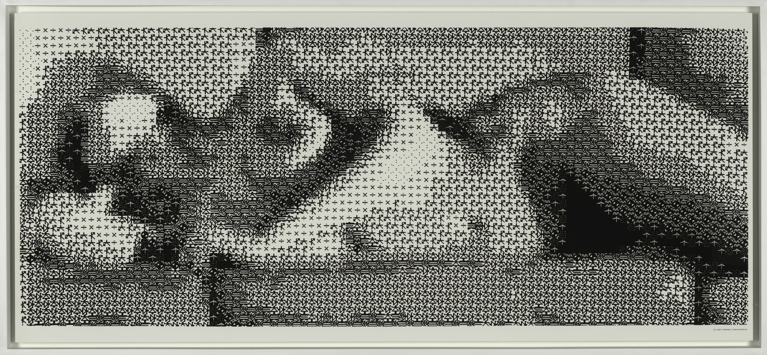 Computer Nude (Studies in Perception I) is the most widely circulated early artwork made using a computer. It demonstrates the unique capacity of the viewer's brain to interpret a composition of abstract symbols grouped to emulate areas of tonal value as a human figure. Leon Harmon, a researcher in cognitive neuroscience, and Ken Knowlton, a computer engineer at AT&T’s Bell Labs, reenvisioned a photograph of dancer Deborah Hay as a bitmap mosaic using a program they developed. Harmon and Knowlton were brought together by Experiments in Art and Technology (E.A.T.). Organized in 1966 by engineers Billy Klüver (American, born Monaco, 1927–2004) and Fred Waldhauer (American, 1927–1993), and artists Robert Rauschenberg and Robert Whitman, this nonprofit group aimed to provide creative minds with access to new technology and engineering professionals.