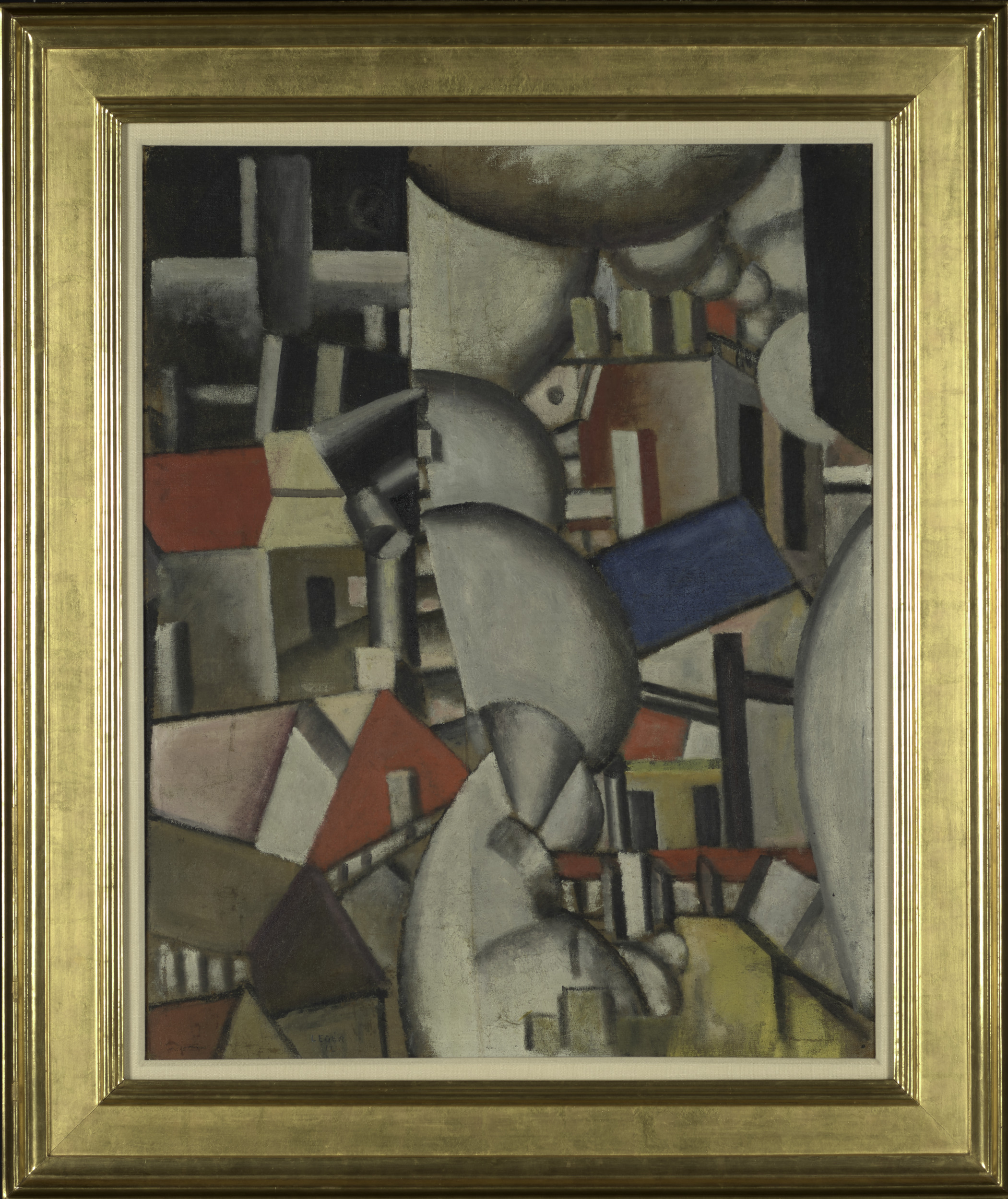 Smoke is one of several of Fernand Léger's studies combining puffs of smoke with a group of buildings. Although this painting is quite abstract, it is possible to make out a large structure with smokestacks in the upper right—presumably the primary source of the smoke that bisects the painting vertically. Other structures can be identified by doors, windows, and roof lines.