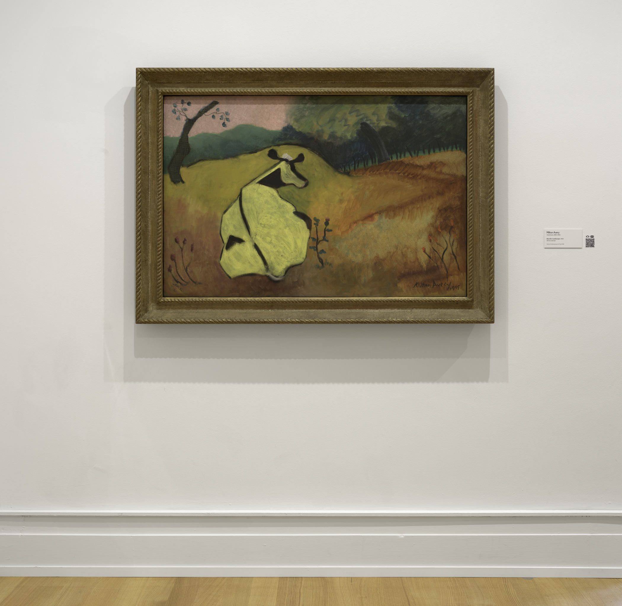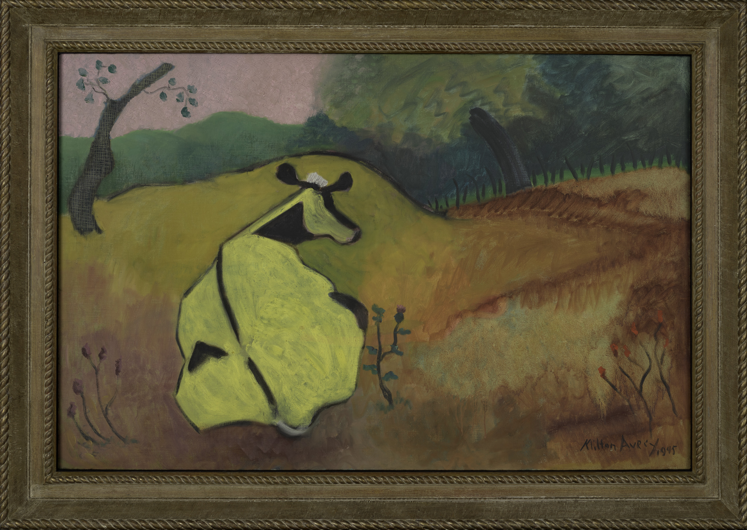 Milton Avery loved nature, and often blurred the lines of reality with his vivacious and, at times, surreal color palette. The quietly humorous Bucolic Landscape features a large yellow cow resting peacefully in a field with gently rolling hills in the background. The cow, its bony anatomy defined in only a few bold lines, dominates the scene. It is lying down, facing away from us. Seemingly soft and rounded black ears separated by a small, white tuft of hair function like antennae at the sides of its head. Avery had two goals he wanted to achieve in his paintings and commented that, “I try to construct a picture in which shapes, spaces, [and] colors form a set of unique relationships, independent of any subject matter. At the same time, I try to capture and translate the excitement and emotion aroused in me by the impact with the original idea.”