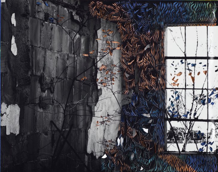 For artist Kari Achatz, “if we look, instead of just see, we can find beauty and wonder” in spaces like those in the background of Parsing Dreams and Urban Resurgence. Achatz began the process of making these works by photographing the Buffalo Central Terminal and abandoned grail silos on the city’s waterfront. She then “draws with the blade”: cutting intricate patterns into and adding dazzling color to each print.
