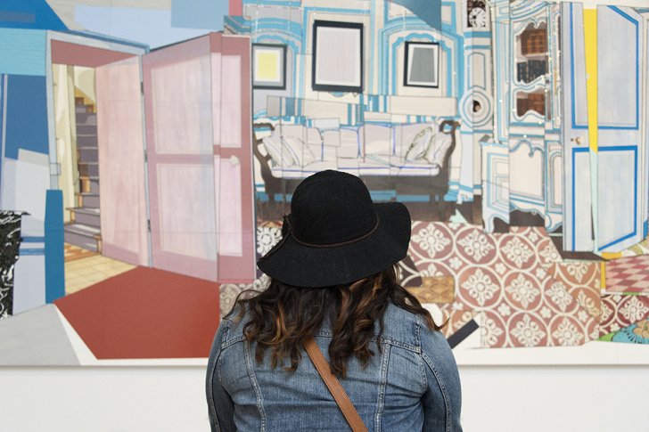 Mickalene Thomas is best known for her elaborate painterly practice involving rhinestones and a colorful palette that explores concepts of beauty and questions what it means to be a woman. Interior: Monet's Blue Foyer, 2012, marks a shift in Thomas’s subject matter; it is part of a series of works in which she moves away from the physical body and, she has said, “experiments with the construction of the intimacy of interior spaces.” It was recently on view in the Sculpture Court during For the Love of Things: Still Life (2016).
