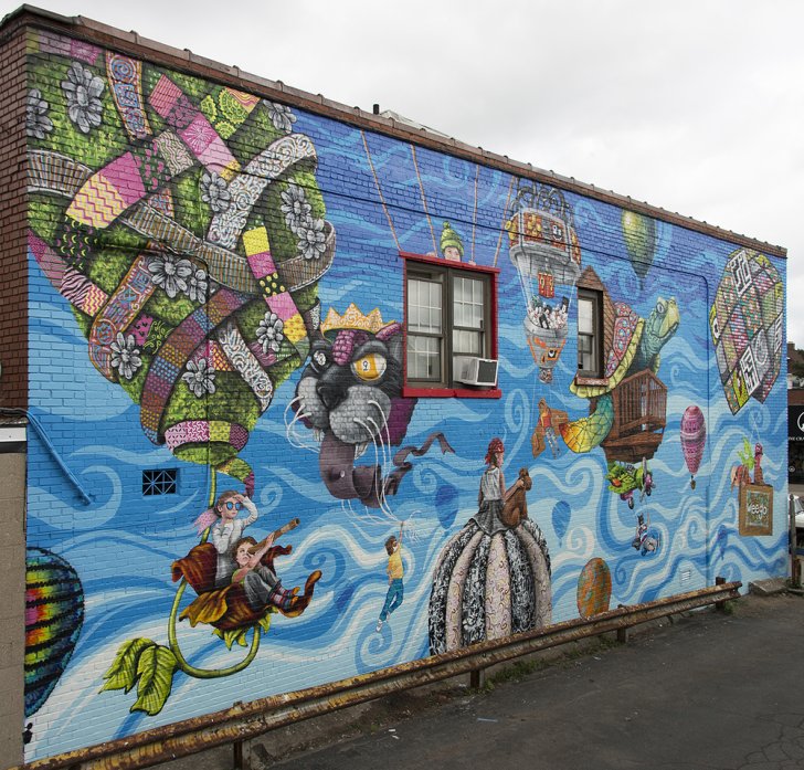 This mural celebrates nostalgia for cartoons, video games, and other imaginative preoccupations of youth. Its title, weego, comes from a pseudonym that the Buffalo-based artist Chuck Tingley and his painting partner, Cincinnati-based artist Matt Grote (a.k.a. OGRE), developed for their collaborative projects.
