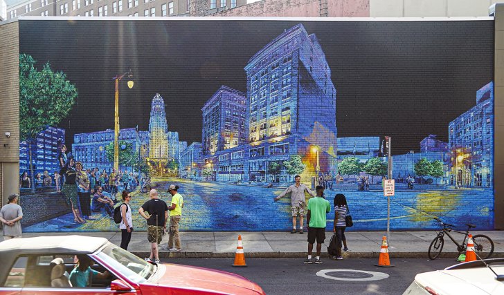 Logan Hicks's Walking Back Time captures a nighttime view down Court Street toward Niagara Square and City Hall, one of Buffalo's signature sight lines. The mural is based on photographs the artist took downtown late at night, a relatively quiet, peaceful time that allows him to “slow down and look at [the environment] with fresh eyes . . . [and] start to see the beauty in the mundane.”