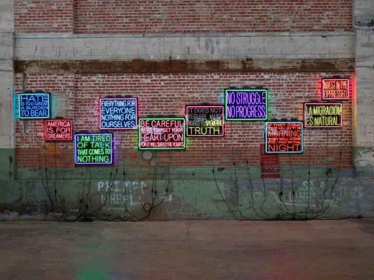 Martinez often quotes historical figures who fought for racial and social justice, carrying their sentiments into the present struggles for equality. These signs deploy the visual language of commercial signage. One can imagine driving down a city street at night with the blaring neon lighting the dark. Just so, the medium that we would more likely expect to advertise a bar or restaurant subverts expectations by communicating unmistakably political messages.