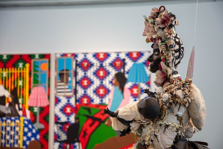 In Central African lore nkisi (plural minkisi) are objects or materials for spiritual protection, often produced or carried by Africans uprooted during the Trans-Atlantic slave-trade. Vanessa german forms her “power figures” in a similar way: from aggregations of the everyday and the symbolic: shells, bottles, keys, stuffed fabric pouches, string, beads, rhinestones. The empowered objects of her figures’ compositions heal, protect, and ward off evil. Their declarative stances and materials imbue the sculptures with complexity, beauty, and magic.