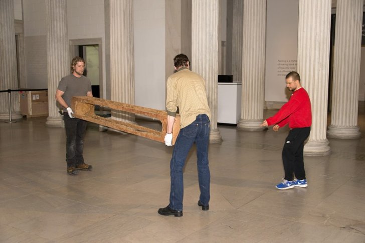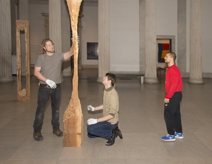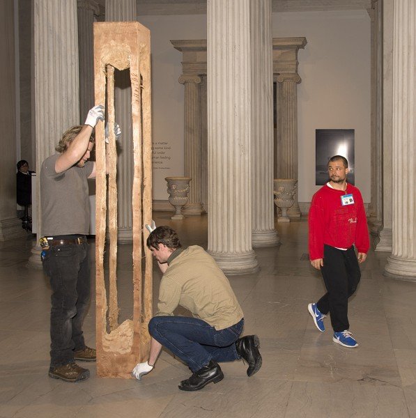David Adamo (right) and the Albright-Knox’s Art Preparation team install the artist’s works in the Sculpture Court. Photograph by Tom Loonan.