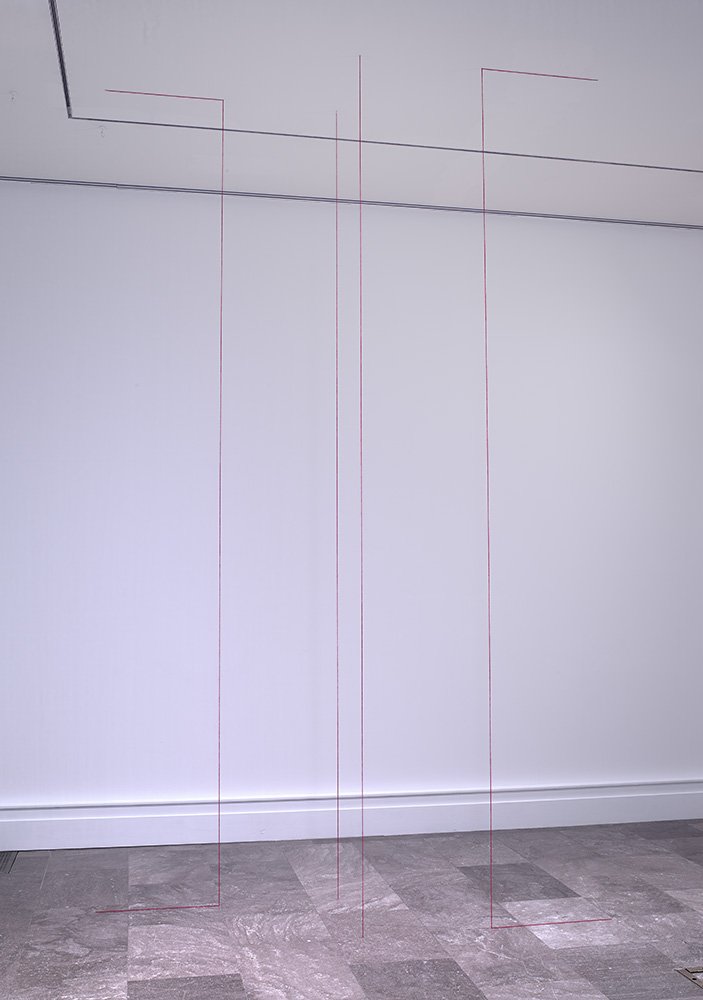 In 1967, Fred Sandback created a groundbreaking composition by outlining a twelve-foot-long two-by-four plank using only string and wire. In later works, Sandback used yarn instead because it creates a softer line and absorbs light. Lacking the mass or weight typically associated with sculpture, each of Sandback’s “drawings in space” invites us to perceive the simplicity of the form in its entirety. Untitled (Sculptural Study, Four‑part Vertical Construction) may evoke the feeling of passage or doorways. This impression of open space reflects Sandback’s desire to make works of art that do not have an inside. He has said, “My work is full of illusions, but they don’t refer to anything.”