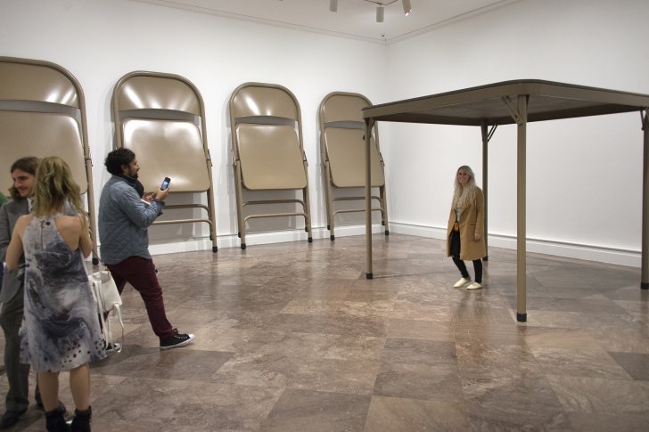While sight may be the sense we’re most familiar with relying on in a museum, some works in this exhibition compel us to rethink what it means to see art. They reward additional looking, offer a moment of contemplation, or prompt a shift in perspective. Any memories we may have of everyday folding card tables and chairs are radically recast when we see these objects at an extraordinary and uncanny scale in Robert Therrien’s No title (folding table and chairs, beige). Our perceptions of space and depth are challenged by the infinite visual loop of reflections inside Lucas Samaras’s Mirrored Room.