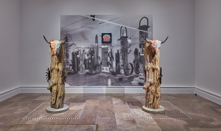 USA appears in Robert Indiana: A Sculpture Retrospective in both its original form and its bronze “translation.” Throughout his career, Indiana identified himself as an American artist, and he emphatically embraced the roadside folk art tradition of the American Southwest in USA. Earlier in the 1960s and '70s, Indiana used “USA” as a motif in several paintings—including USA/EAT, on the wall behind these two sculptures—pairing it with other words and motifs.