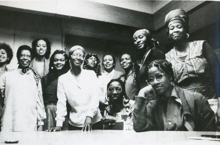 Pat Davis (American, 1943–2017). “Where We At” Black Women Artists. From left to right: Carol Blank, Pat Davis, Victoria Lucus, Crystal McKenzie, Dindga McCannon, Kay Brown, Modu Tanzania, Jeanne Downer, Priscilla Taylor, Emma Zuwadi, Akweke Singho, Linda Hiwot, and Saeeda Stanley (1980). Digital C-print. Courtesy of the artist. © Estate of Pat Davis.