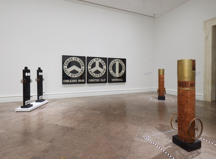 Installation view of Robert Indiana: A Sculpture Retrospective. From left: Ahab, 1962 (cast 1991); Ahab, 1962; The Melville Triptych, 1962; Call Me Ishmael, 1964/1998; and Call Me Indiana, 1964/1998. Photograph by Tom Powel Imaging. © Morgan Art Foundation Ltd / Artist Rights Society (ARS), New York
