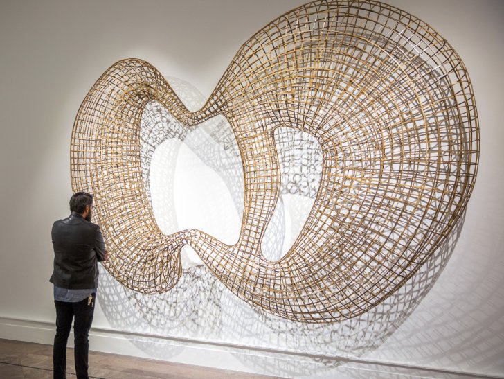 Sopheap Pich shapes his sculpture using bamboo (as is the case in Cycle), rattan, burlap culled from rice bags, and other materials that speak to the daily interactions between the landscape and its residents in Southeast Asia. Pich currently lives and works in Cambodia: the home country he and his family were forced to flee decades prior during a period of civil war. In Cycle, the artist twisted a gridded bamboo armature into an organ-like shape that alludes to the body in both its form and resiliency under pressure.