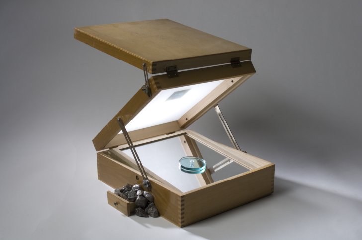 But it’s not just cleverness at work in the pairing of image and object, as Mead refers to it. One of the works that strikes us is a one-inch cube of materials taken from Mead’s childhood home, where he grew up one of eleven siblings. Placed on a scientific scale, it doesn’t even tip the balance. Admittedly, the scale is rigged, but the message is clear: all that memory encompasses weighs less than nothing. It’s a poignant moment in a cascade of ideas and objects.