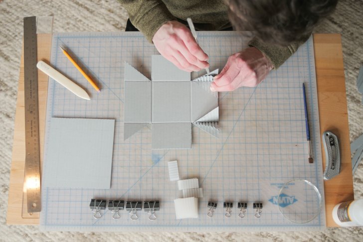 Art Preparator Karl Mattson creates an archival box for small collection works.