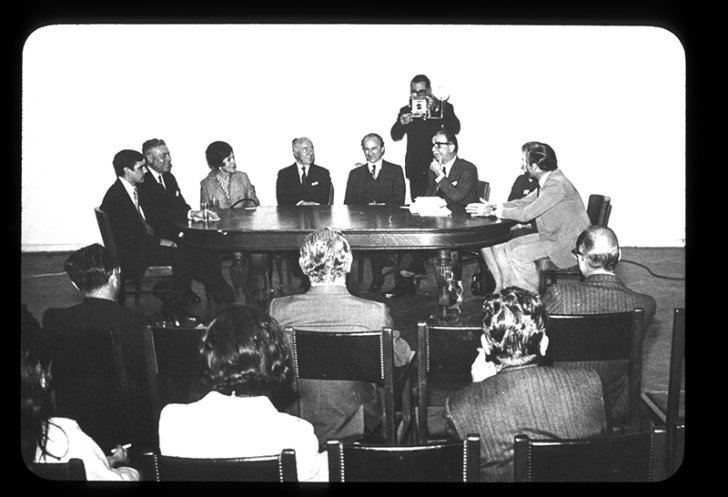 In the photos above and below, Albright-Knox representatives, including Knox and Director Gordon M. Smith, address members of the press regarding the exhibition on October 20, 1969. A few days after this press conference, Knox and Smith accompanied the exhibition to the Museo Nacional de Bellas Artes in Buenos Aires.