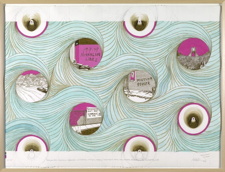 As an artist, Millie Chen is committed to exploring art’s ability to convey conflict and trauma. This line of questioning has led her to atrocities historical—as in her Miseries & Vengeance wallpapers—and more recent, as in the series “Prototypes 1970s.” Chen designed each work in the series as a prototype for a repeating patterned wallpaper, like the Miseries & Vengeance wallpapers. Taken together, the images trace out, year by year, some of the most important events reshaping the world between 1970 and 1979, including the Kent State shootings (1970), Iranian Revolution (1979), and the beginnings of what would become decades-long conflicts in Angola, Lebanon, and Morocco (1975).