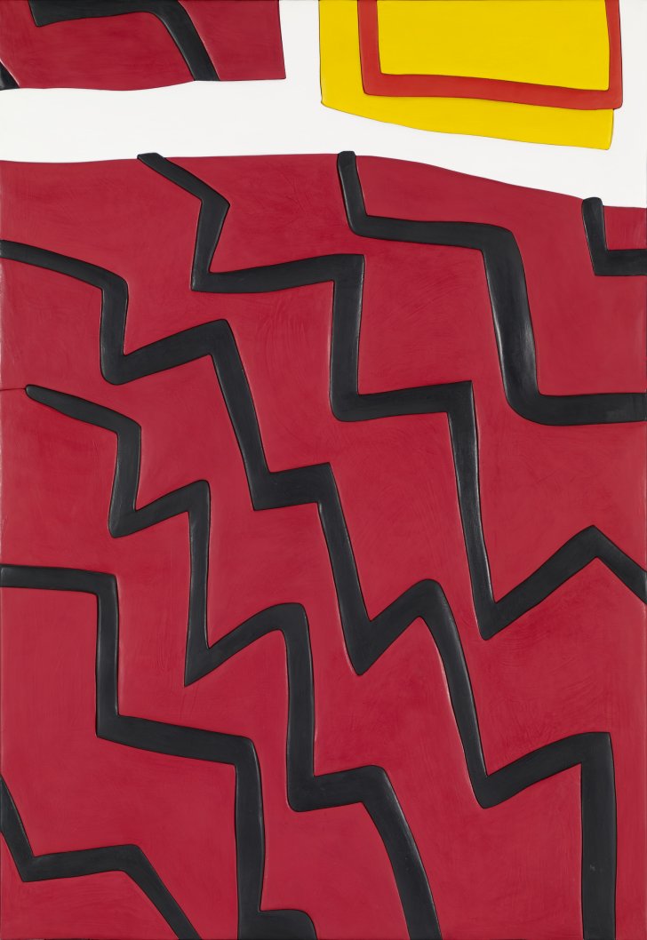 In fact, Blow up 1 started as a wholly non-material, digital image. For this and related abstractions, Benning begins by zooming in and out on a touchscreen image until arriving at a detail that makes sense as a stand-alone composition. Based on this selection, the artist then cuts corresponding forms from particle board, covers these with brightly hued resins, and finally fits the pieces back together, almost like a puzzle.