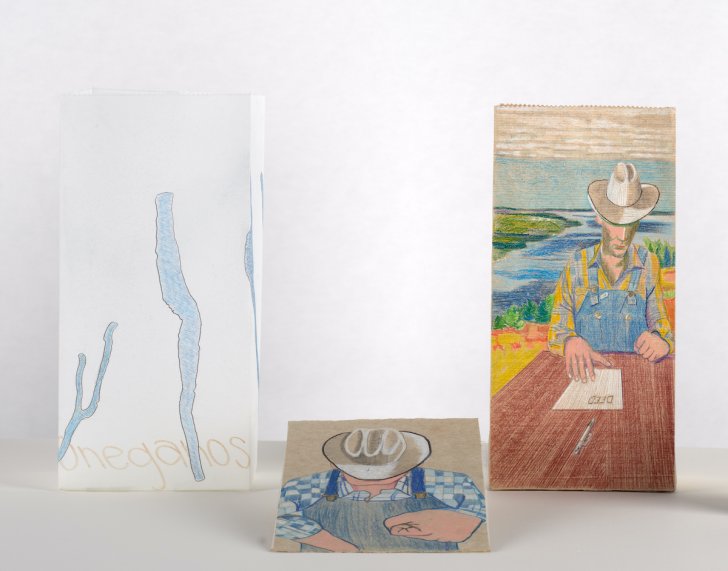 No Fracking! consists of two bags in dialogue. One side of a brown bag practically screams “No Fracking,” with the ‘g’ missing from the upward cast of the word, an urgent but colloquially accented call. A man in overalls and a large cowboy-style hat casts his gaze down at a “deed.” The other side depicts a violent volcano-like eruption of fire from the ground. A white bag consisting of mostly empty space depicts a series of finger-like lakes, spaces which may be contaminated as part of the industrial practice. A single word, oneganos, the Seneca for waterlines, is scrawled across the bottom of one side.